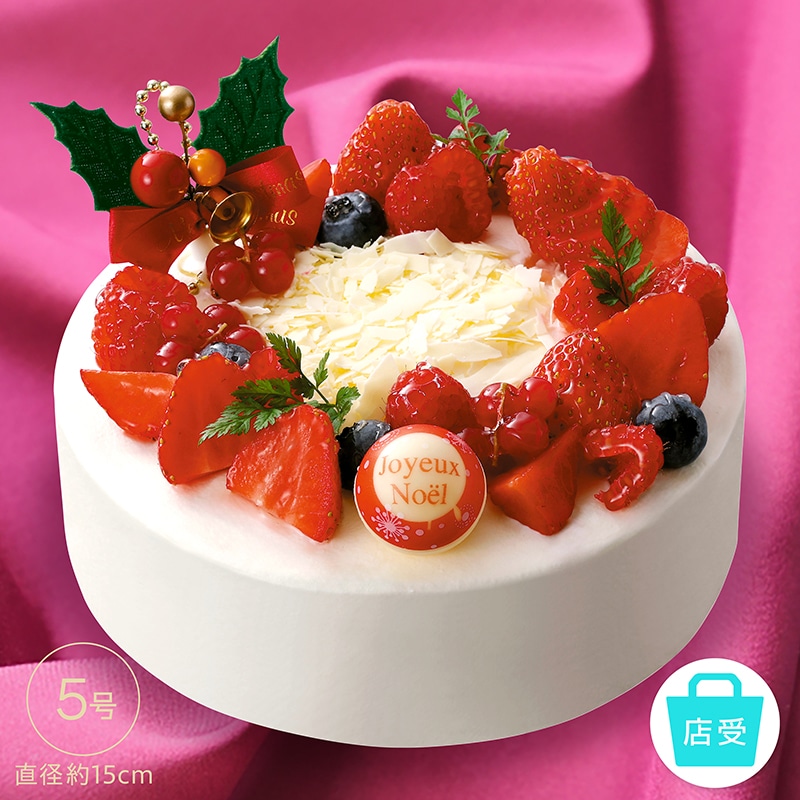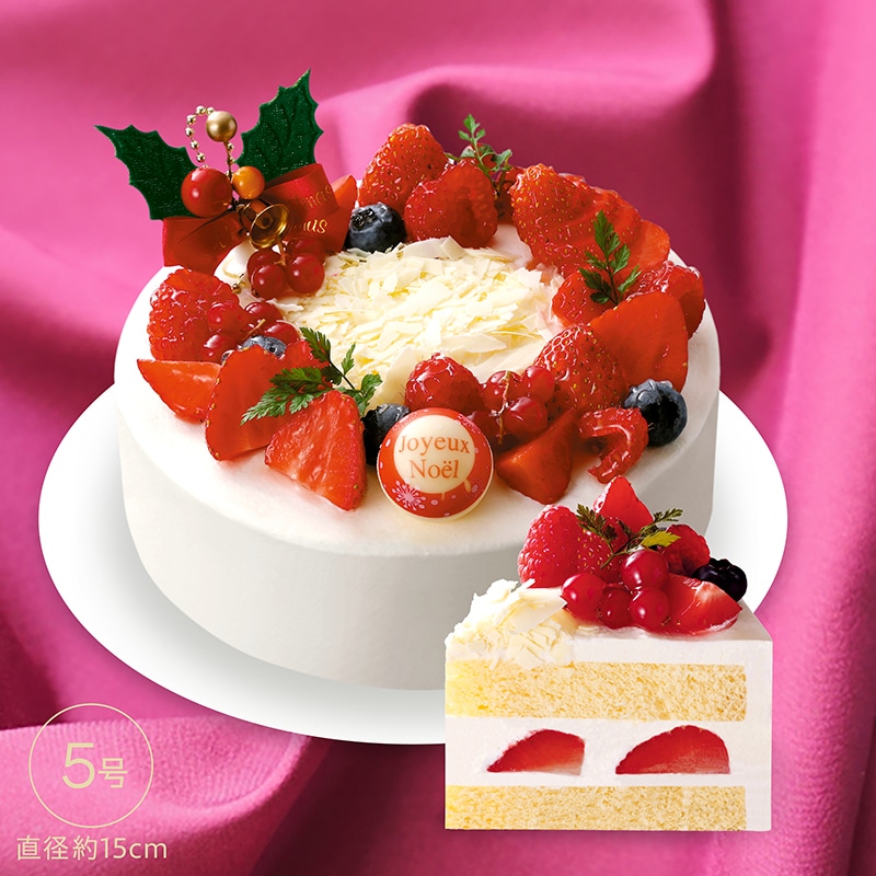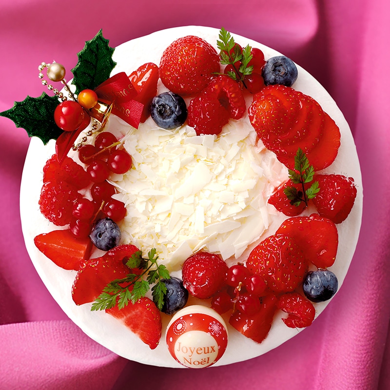 しっとりと焼き上げたジェノワーズと、国産苺の織りなす上品で華やかな口当たりの仕上がりに。クリスマスリースをイメージしたデコレーションもお楽しみください。