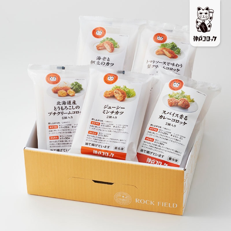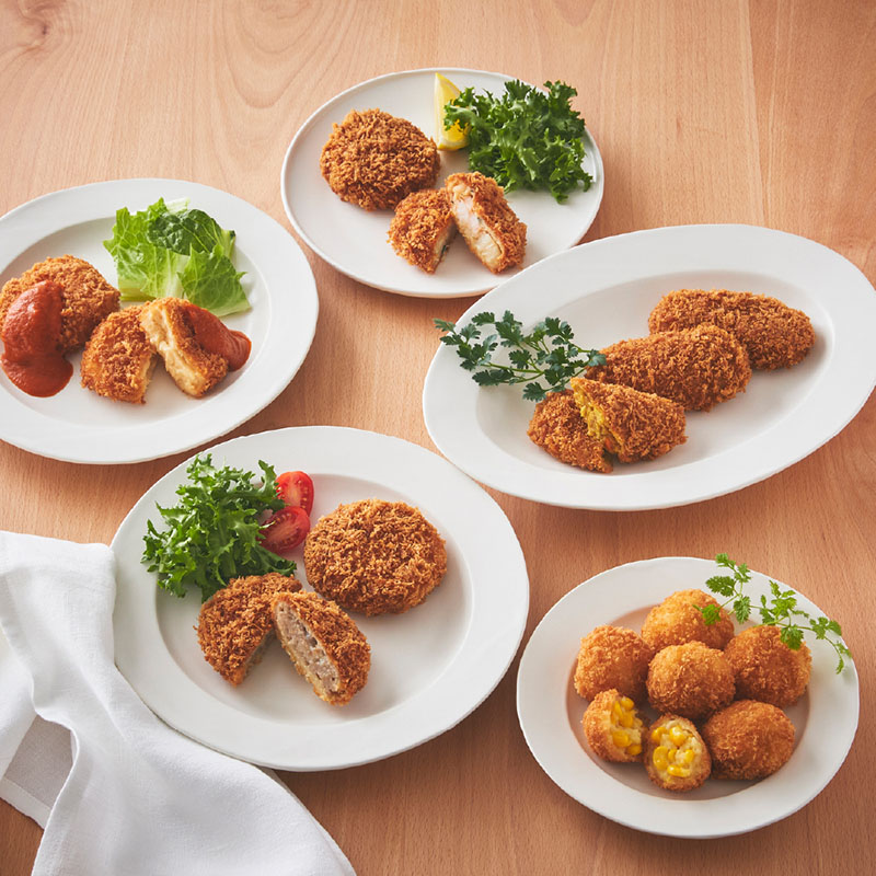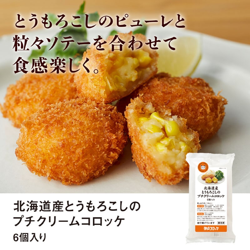 - 北海道産とうもろこしのプチクリームコロッケ 6個入り×1Pトマトソースで味わう 蟹クリームコロッケ 2個入り×1P海老と帆立のカツ 2個入り×1Pジューシーミンチカツ 2個入り×1Pスパイス香るカレーコロッケ 3個入り×1P