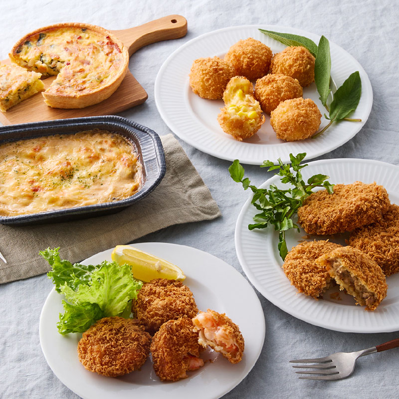 - ぷりぷりプチ海老カツ 3個入り×1Pまろやか海老グラタン×1Pベーコンとほうれん草のフロマージュキッシュ×1P北海道産とうもろこしのプチクリームコロッケ 6個入り×1P旨みに感動 ビーフコロッケ 3個入り×1P