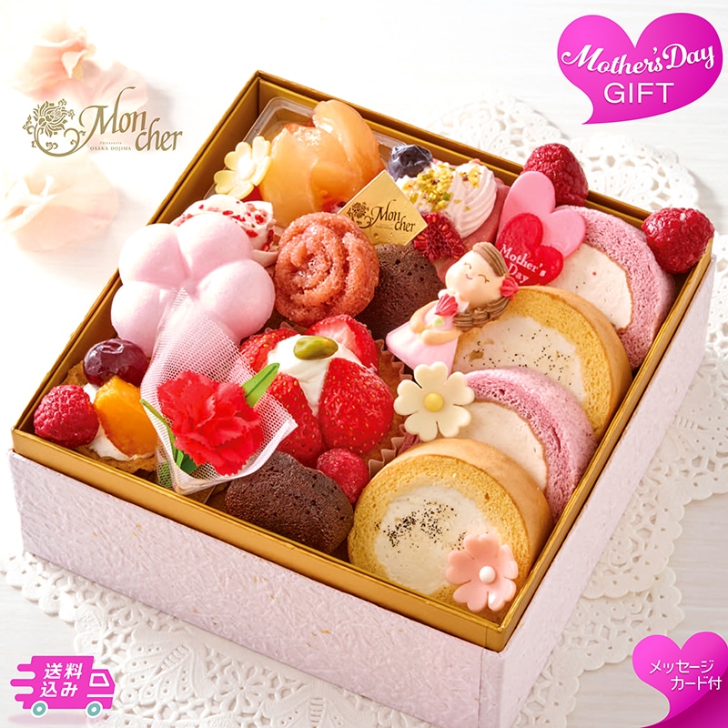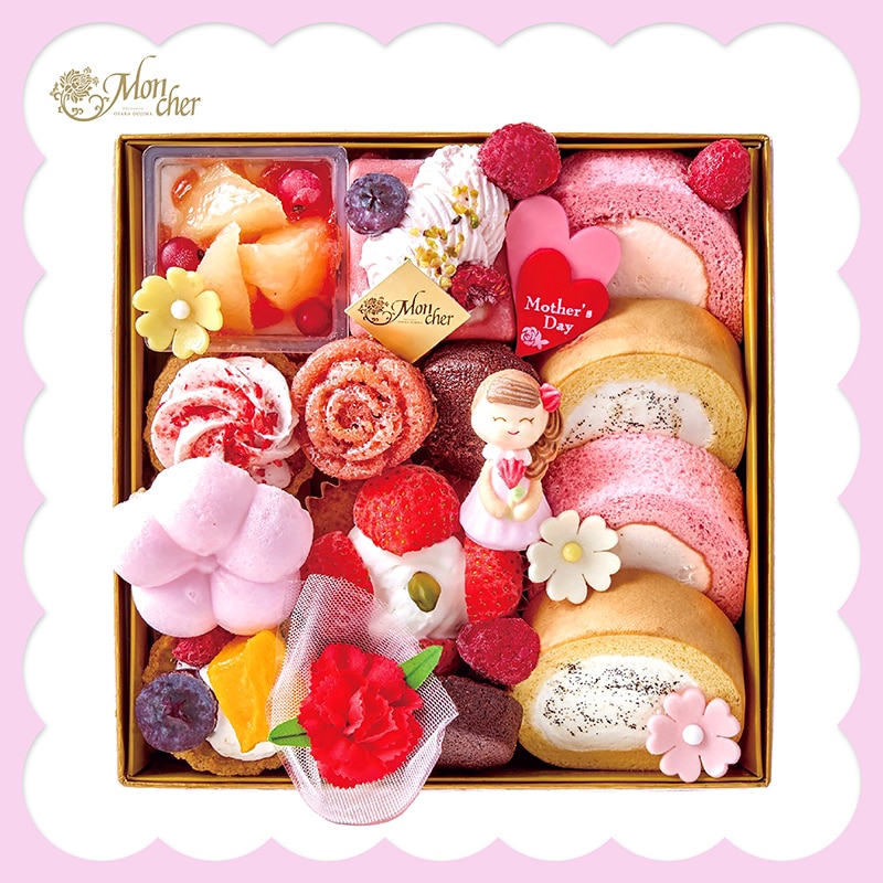 - ミニロール(バニラ・ベリー)×各2、フィナンシェショコラミニ×2、ムースピスタチオルージュ、桃プリン、ベリークリームタルト、梅ロッシェ、フルーツタルト、ストロベリーケーキ、ミニバラのフィナンシェ(フランボワーズ)、スマイルママ(砂糖菓子)、母の日ダブルハート(ハート型チョコ菓子)、お花型チョコ(ピンク・白・黄)、果実(フランボワーズ×5・ブルーベリー)、造花(カーネーションピック)