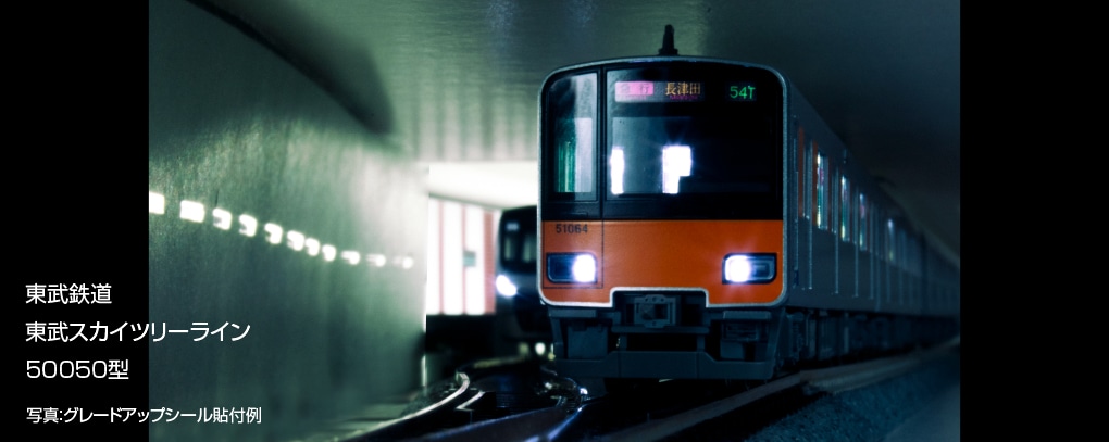 アルミ車体に鮮やかなオレンジのデザインの東武スカイツリーライン50050型は、東上線用50000型をベースに平成17年(2005)に登場した10両貫通の東京メトロ半蔵門線・東急田園都市線直通対応車両で、埼玉県の久喜・南栗橋から、東京メトロ半蔵門線を経て、神奈川県の中央林間まで、3都県におよぶ直通運転を行っています。 後期に製造されたグループは強制換気装置がなく、1段下降窓が特徴になっています。近年ではライトがLEDに換装されています。 兄弟車の東上線用50070型とは異なる先頭車車体長、運転台コンソール形状・床下機器形状を的確に作り分けて製品化いたします。東武伊勢崎線・日光線、東京メトロ半蔵門線、東急田園都市線と広範囲で活躍し、直通運転で顔を並べる東京メトロ18000系、東急5000系とのすれ違い運転をお楽しみいただけます。