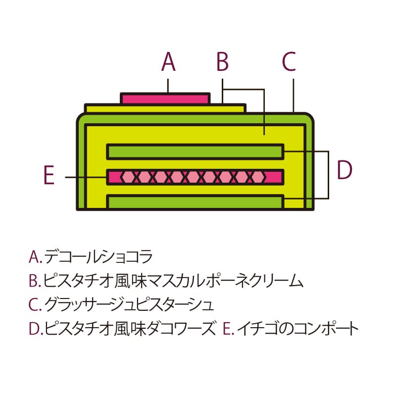 クリスマスに彩りを添える鮮やかなコントラスト。ピスタチオが持つ香ばしい風味と、イチゴのフレッシュな爽快感や酸味がフルーティーに広がります。