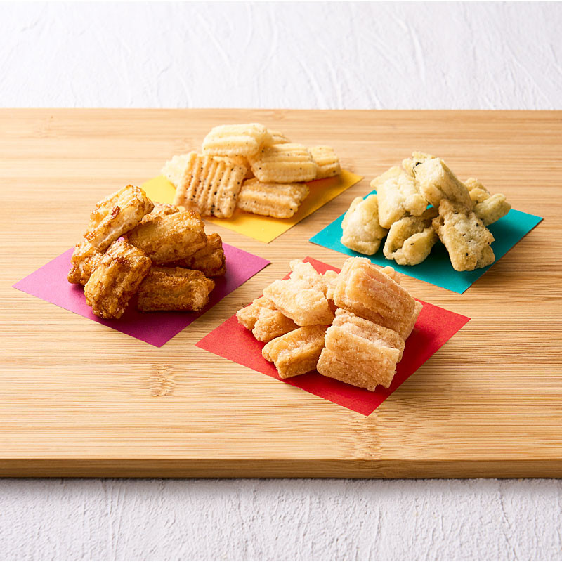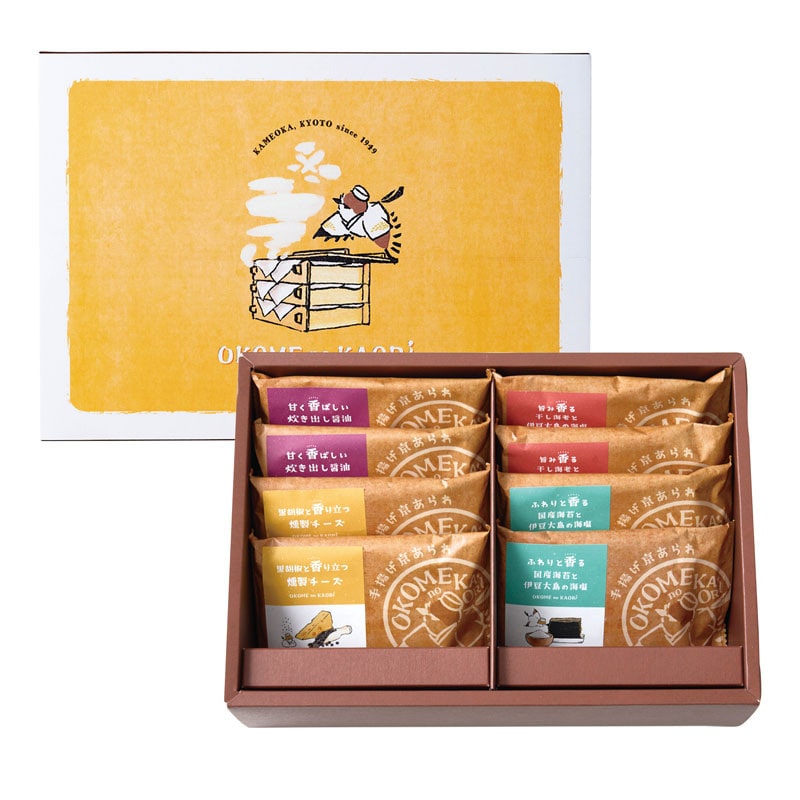 - 内容量:手揚げ京あられ×8袋(旨み香る干し海老と伊豆大島の海塩14g・甘く香ばしい炊き出し醤油15g・ふわりと香る国産海苔と伊豆大島の海塩15g・黒胡椒と香り立つ燻製チーズ12g×各2袋)