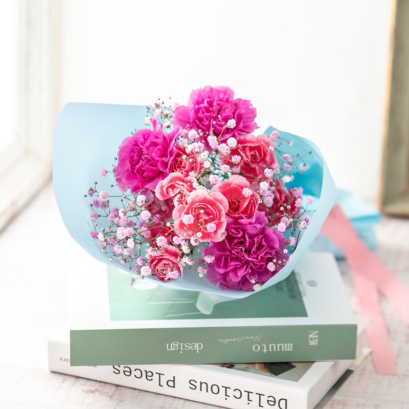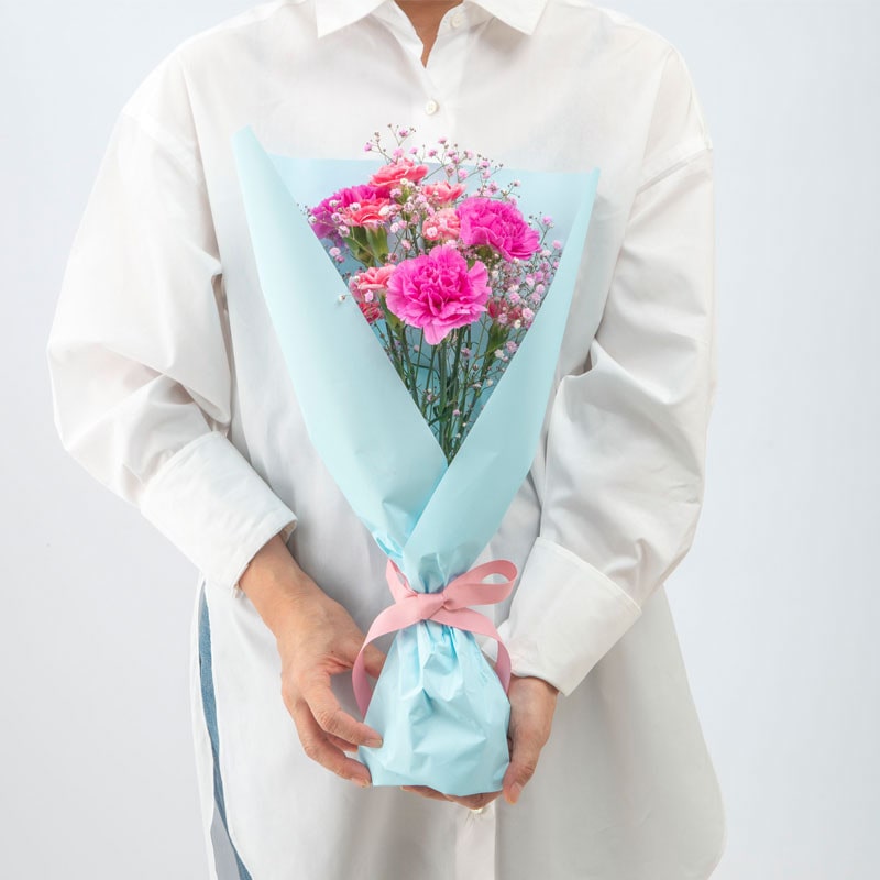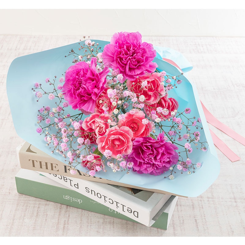 内容量:カーネーション(濃いピンク×3)、スプレーカーネーション(複色ピンクホワイト×2)、カスミソウピンク×1、ラッピング、リボン