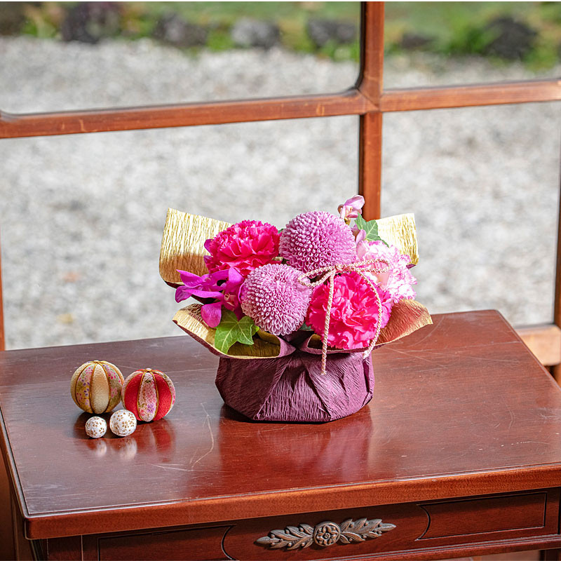 内容量:カーネーション(濃いピンク×2、複色ピンクホワイト×1) 、ピンポンマム(ピンク×2)、ラン、グリーン、ラッピング、組紐