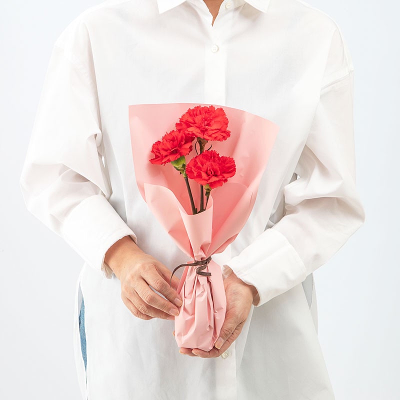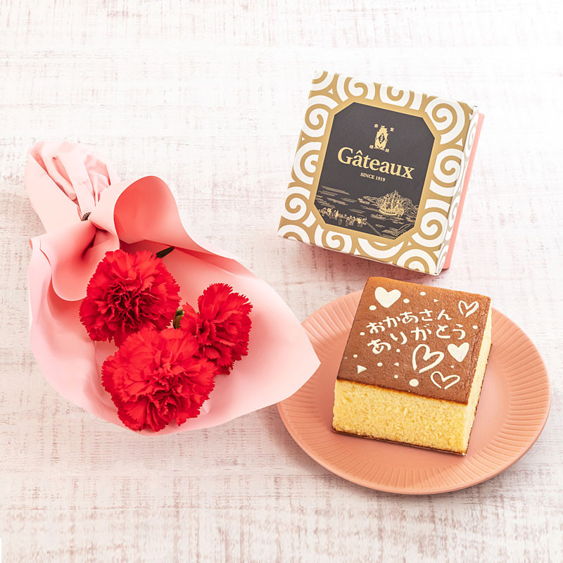内容量:カーネーション(レッド×3)、ラッピング、リボン、長﨑堂「絵柄入りカステーラ 」(1個)