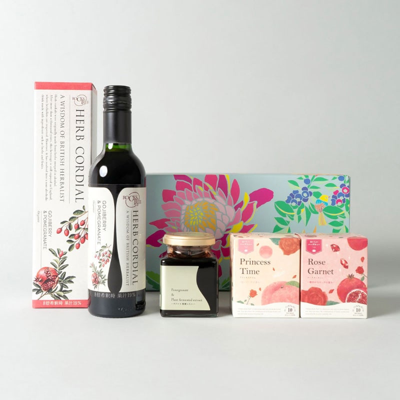 - ザクロ発酵エキス200g、おいしいハーブティー10ヶ入×2、ハーブコーディアル360ml