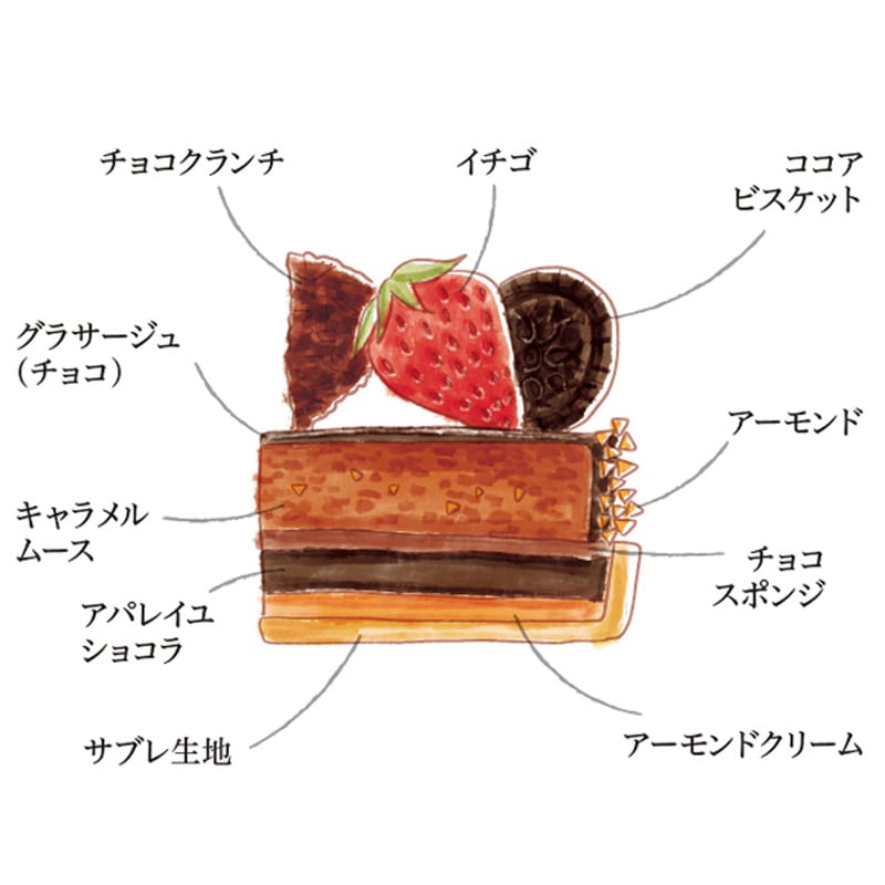 ほろ苦いチョコレートやキャラメルには甘酸っぱい苺が相性ぴったり。デコレーションはクリスマスらしく、にぎやかに仕上げています。クリスマスにチョコレートも苺も味わいたい。そんな方にぴったりなクリスマスタルト。
