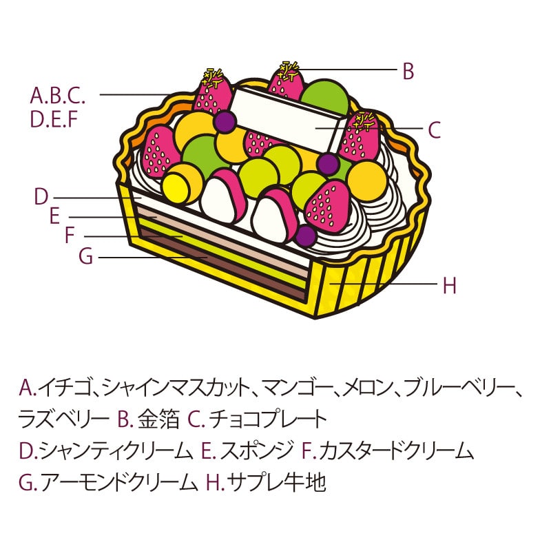 宝石に見立てた色とりどりの丸いフルーツが散りばめられたタルトは可愛く、そして華やか。ベースはバターとアーモンドの風味豊かなさっくりとしたタルト生地にはコクのあるカスタードクリームを合わせ、カラフルな6種類のフルーツをふんだんに飾りました。ひと口食べるごとに違った味わいがお楽しみいただけるタルトになっています。