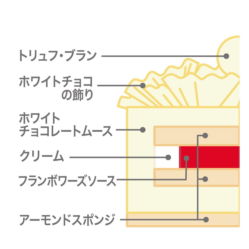 ホワイトチョコレートムースの繊細な味わいと、フランボワーズソースの爽やかな酸味。ホワイトチョコの飾りで華やかに仕上げました。