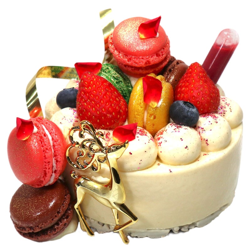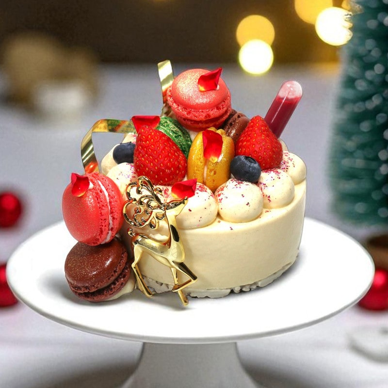 ザクザクとしたクルスティヤンの上に、しっとりとしたのスポンジ、フランボワーズクリーム、ピスターシュクリーム、ホワイトチョコのムースを重ねました。色とりどりのミニマカロンとベリー、金のトナカイを飾った、華やかでときめくケーキです。