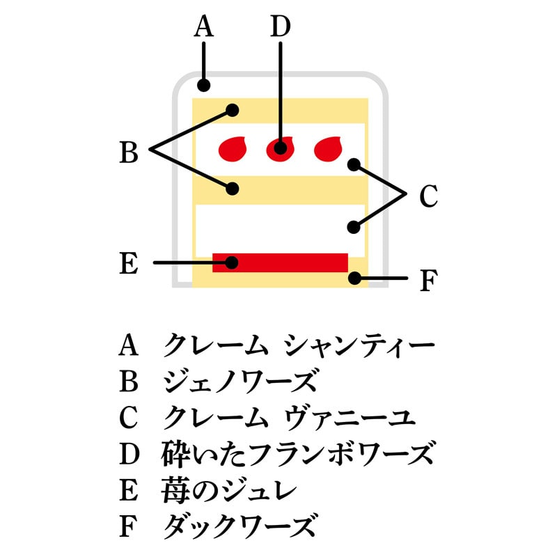 フランスのシャンボール城をイメージしたアントルメ。ヴァニラクリームに苺のジュレ、ダックワーズ、ジェノワーズを重ね、シャンティークリームで仕上げました。中にしのばせたフランボワーズがアクセント。