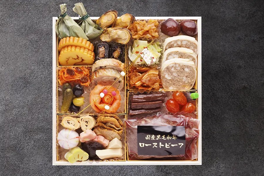 国産黒毛和牛のローストビーフ|鰊昆布巻|トリュフ入りチキンガランティーヌ|トラウトサーモンローズ|パーナ貝 燻製オイル漬け|伊達巻|帆立旨煮|くらげ甘酢和え|北海道産豚肉のパテ・ド・カンパーニュ|など、計26品