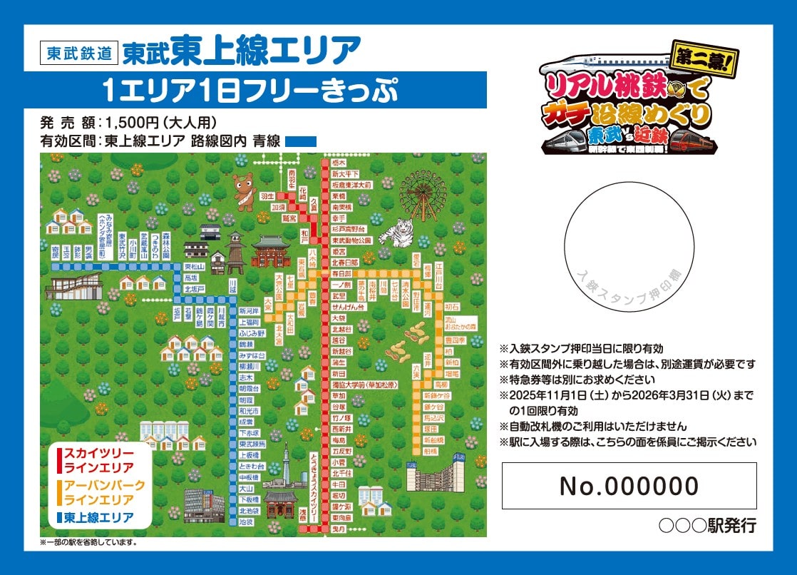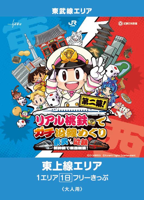 人気コンテンツ「桃太郎電鉄」とコラボしたイベント「リアル桃鉄でガチ沿線めぐり 東武 vs 近鉄 新幹線で東西制覇!」参加券と東上線エリアフリーきっぷのセットです。