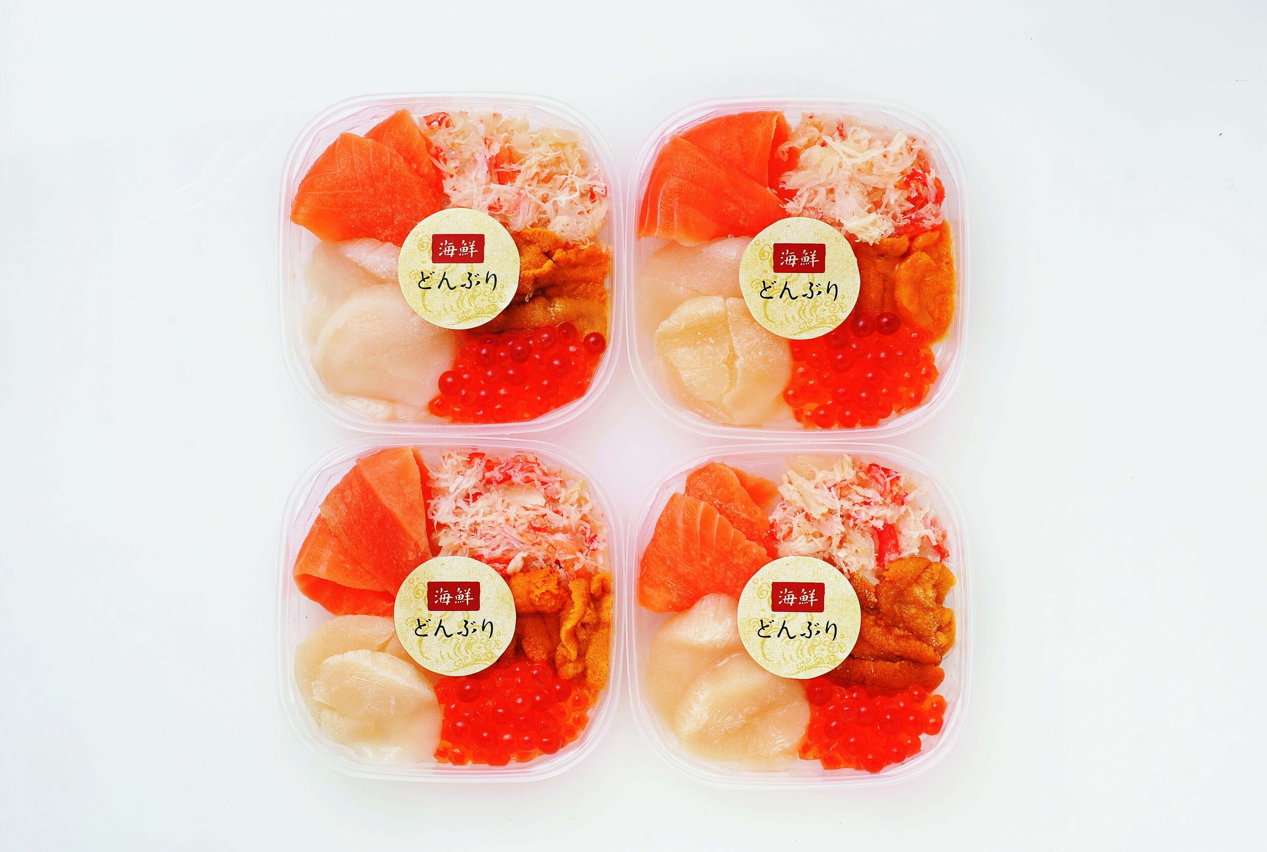 - 海鮮どんぶりの具(サーモントラウト2枚、帆立2枚、ずわい蟹ほぐし身、いくら醤油、うに)/計60g×4個