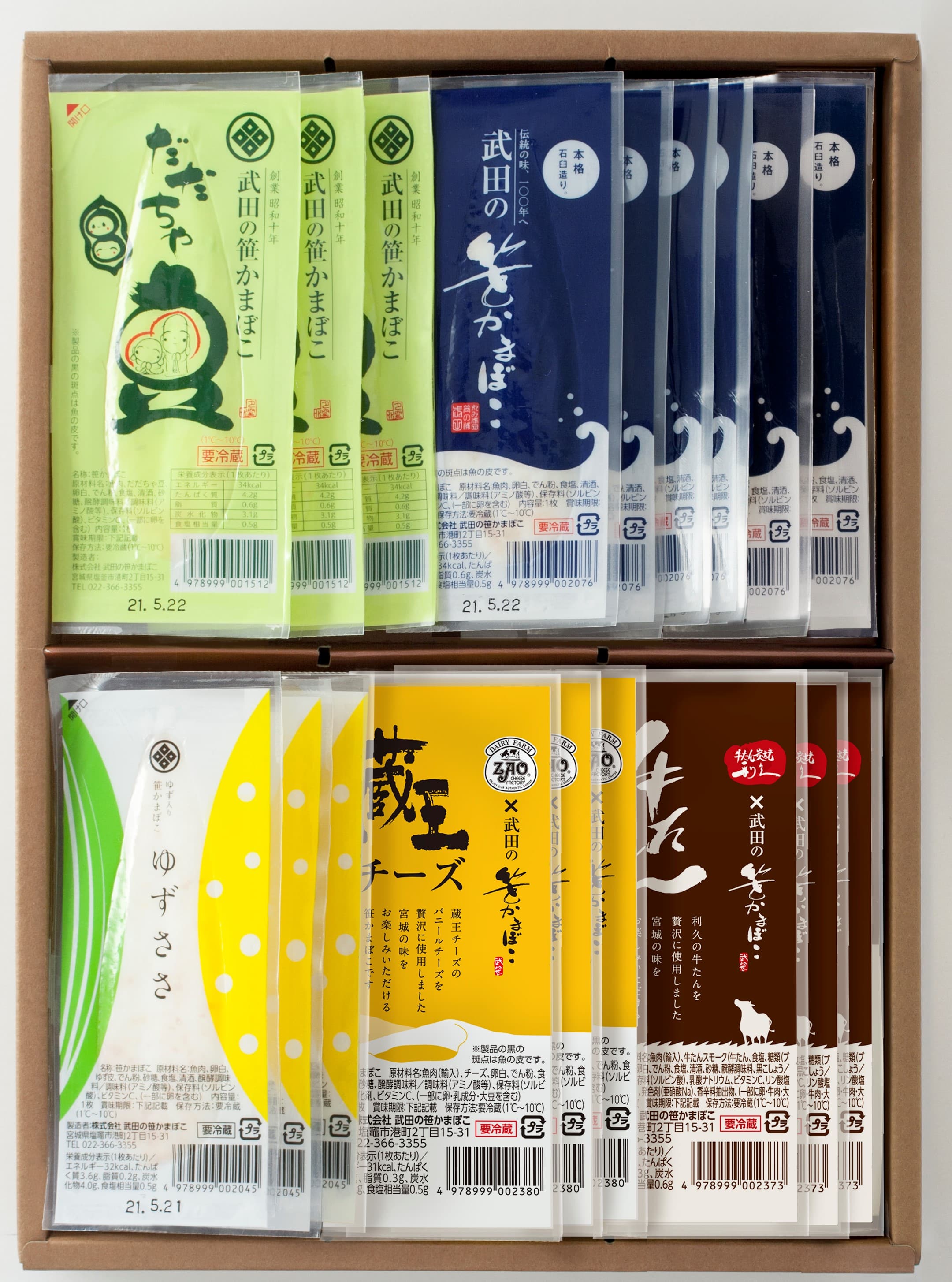 - ささかま6枚、牛たん入り・ゆず入り・チーズ入り・だだちゃ豆入り/各3枚 計18枚入