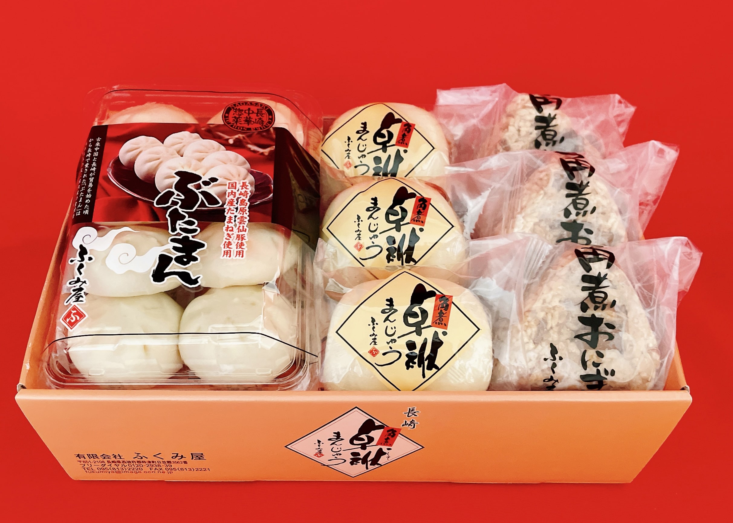 - 長崎ぶたまん26g×8、角煮卓袱まんじゅう60g・角煮おにぎり105g/各3個