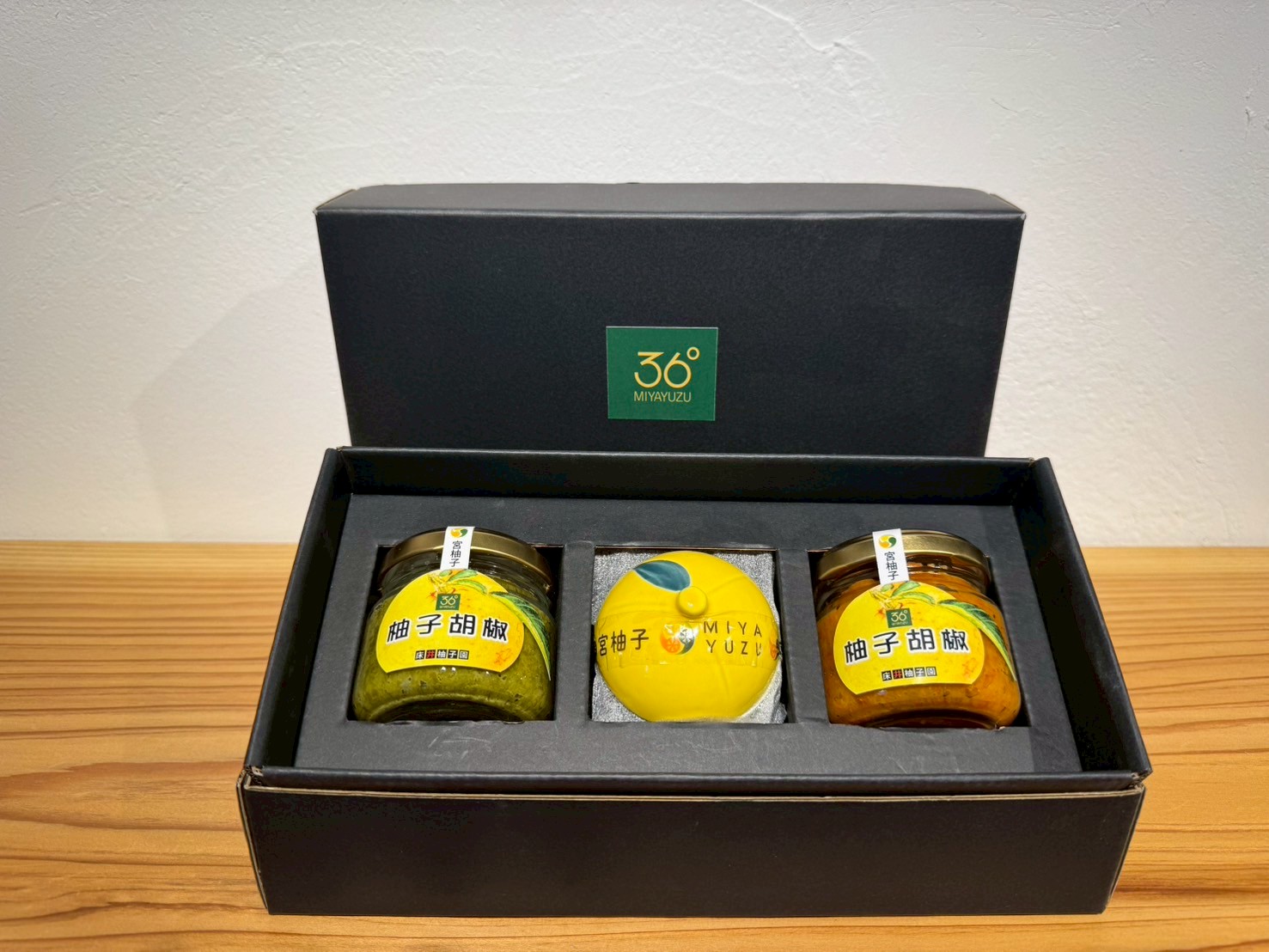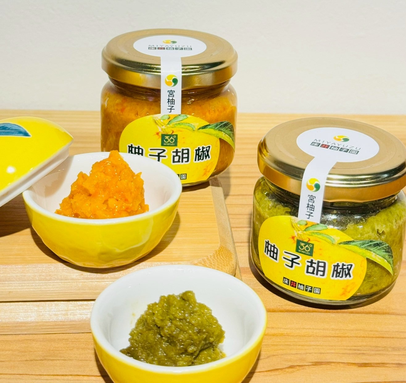 - 青柚子と青唐辛子の柚子胡椒・黄柚子と赤唐辛子の柚子胡椒/各80g、ゆずの形の陶器の入れ物
