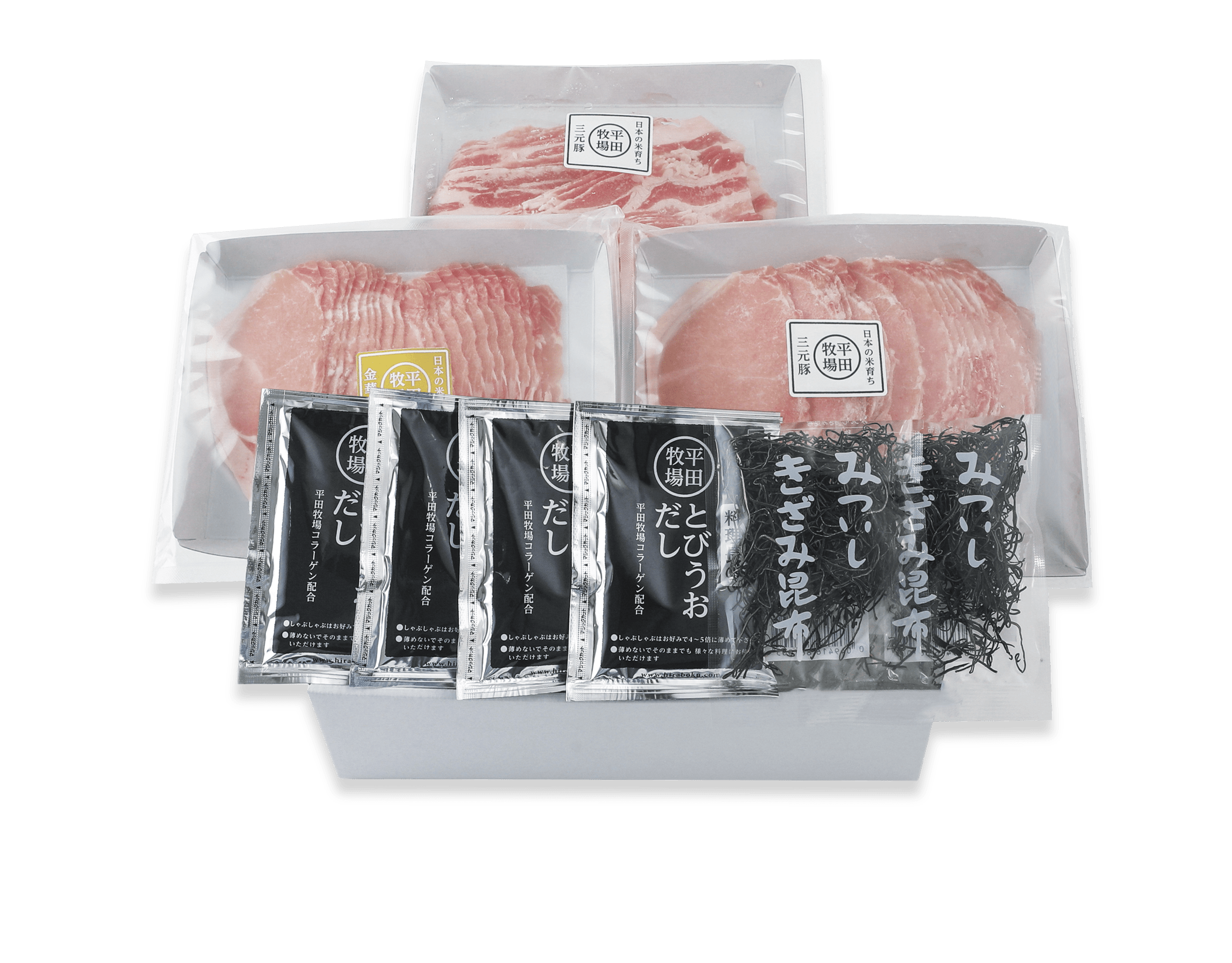 - 金華豚ローススライス・三元豚バラスライス/各200g×1、三元豚ローススライス(300g)×1、とびうおだし(50ml)×4、きざみ昆布(10g)×2