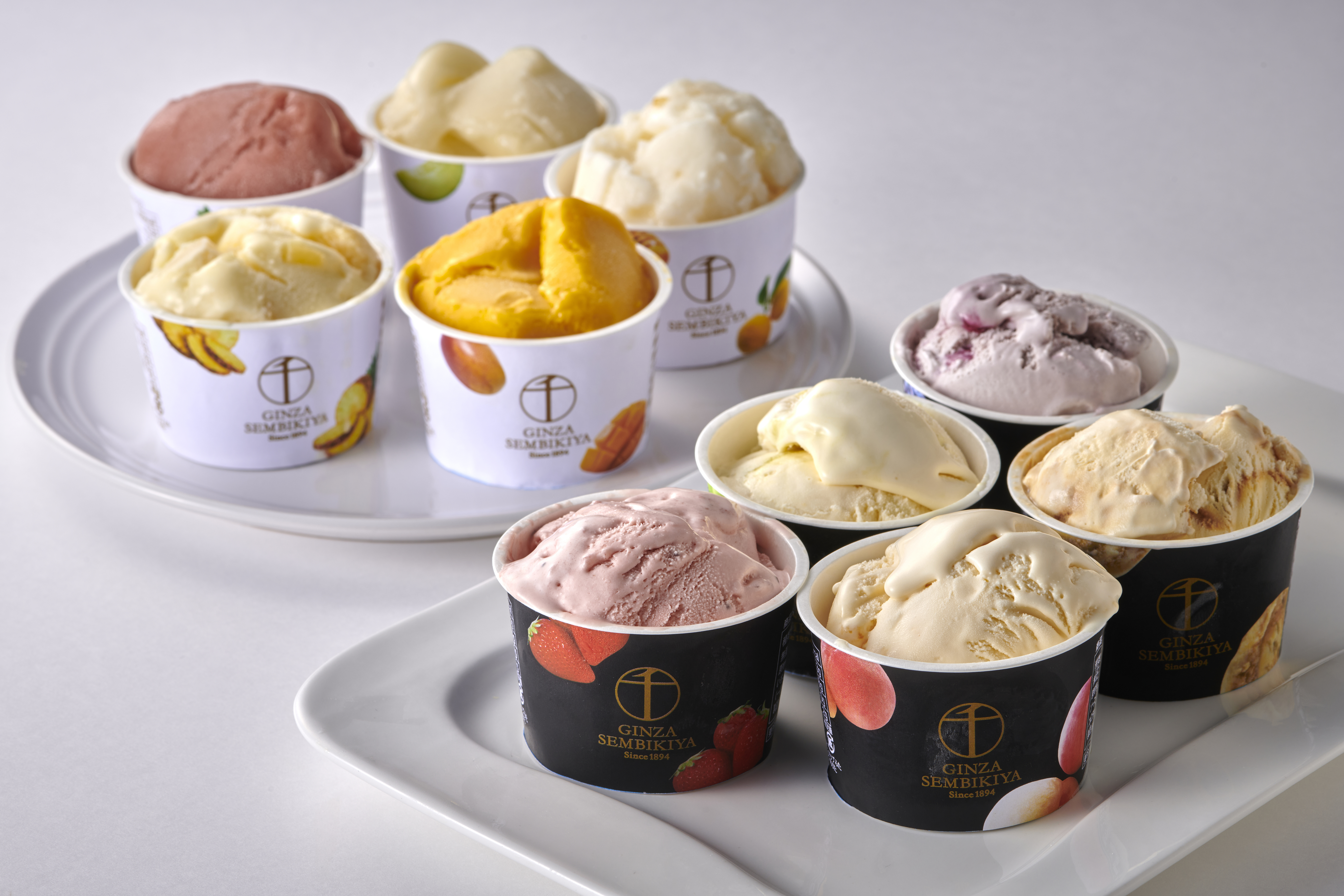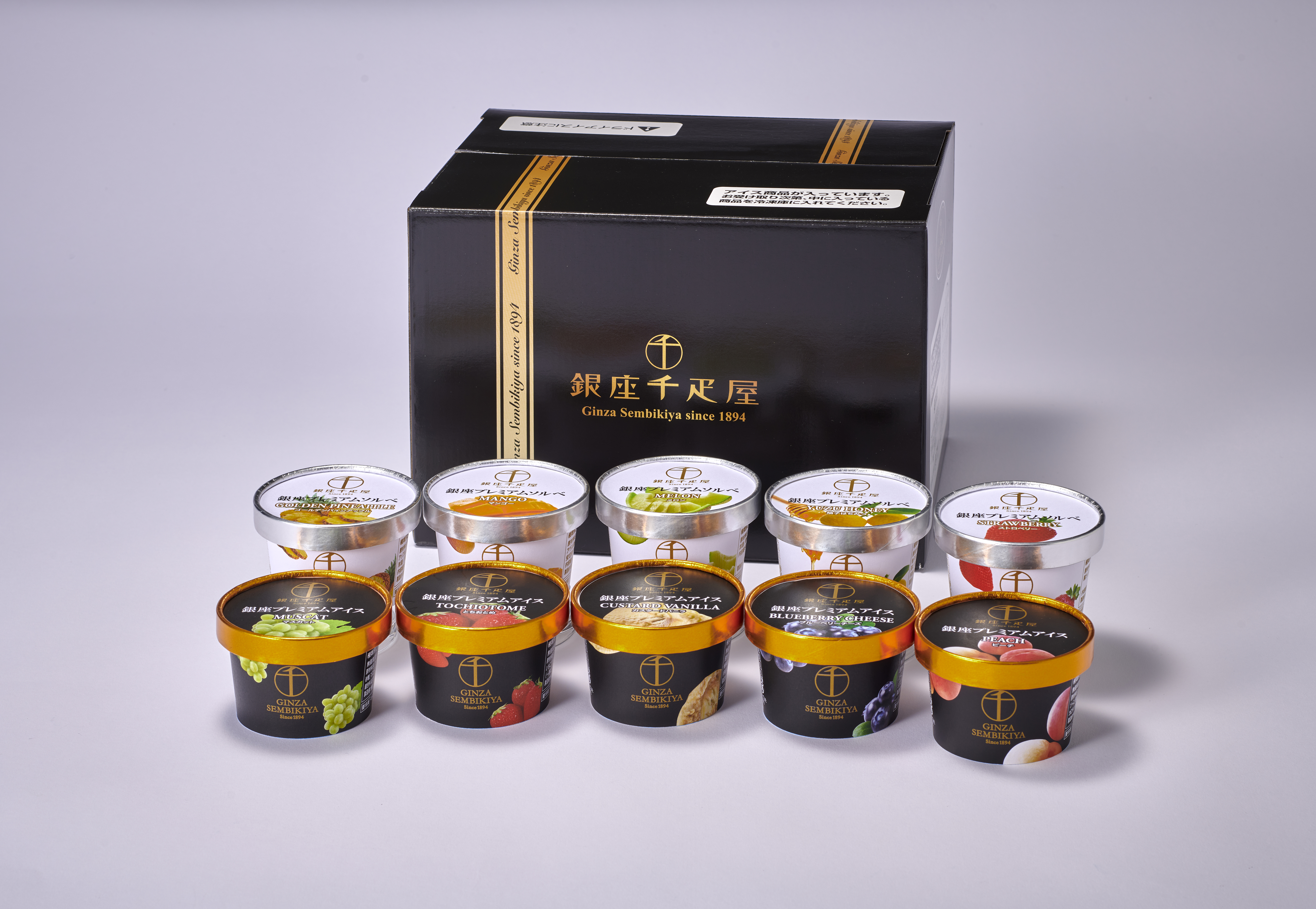 - プレミアムアイス(カスタードバニラ、とちおとめ、マスカット、ピーチ、ブルーベリーチーズ)/各90ml×各1個、プレミアムソルベ(マンゴー、柚子はちみつ、メロン、ストロベリー、ゴールデンパイン)/各90ml×各1個 計10個