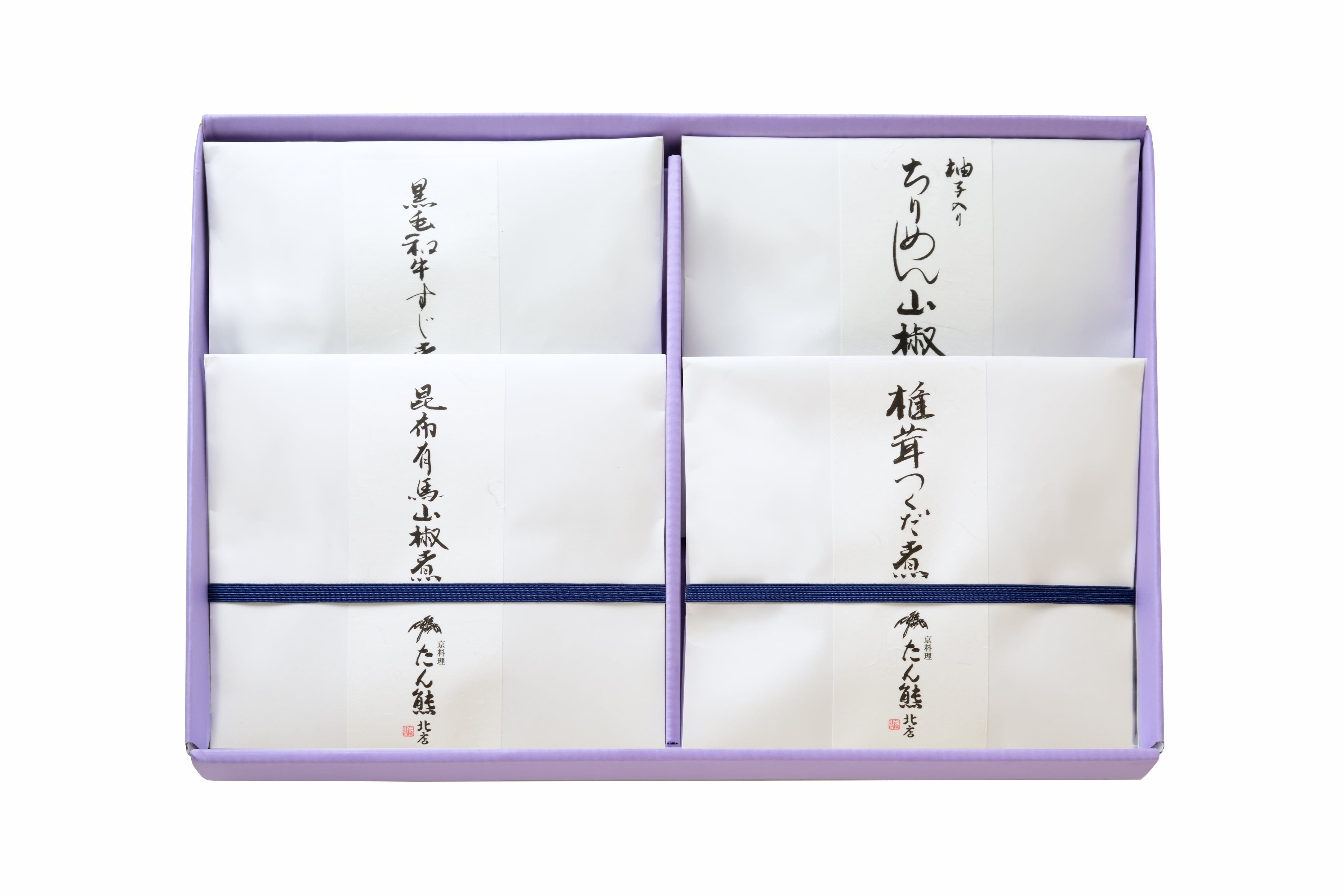 - 黒毛和牛すじ煮70g、柚子入りちりめん山椒50g、昆布有馬山椒煮70g、椎茸つくだ煮80g