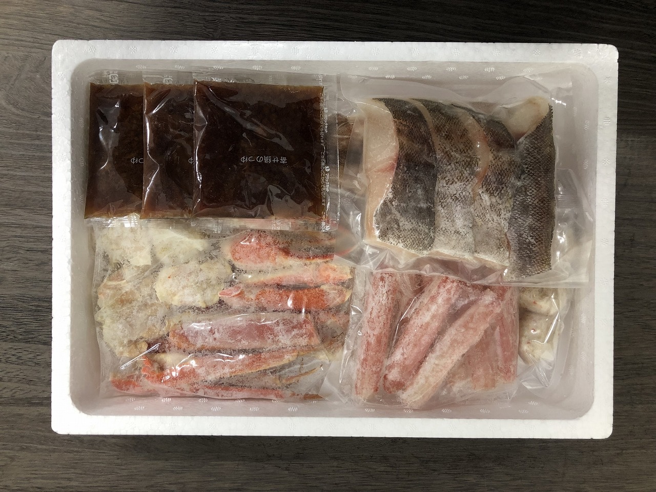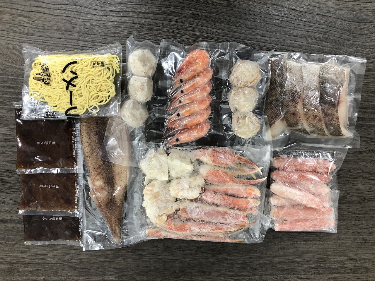 - ゆでずわいがにカット300g、生ずわいがに棒ポーション100g、ボイル海老6尾、ボイル帆立3個、かに入つみれ3個、ツボ抜きいか100g×1尾、助宗鱈切身40g×4切、冷凍生ラーメン80g×1玉、たれ(濃縮:醤油仕立て)50ml×3袋