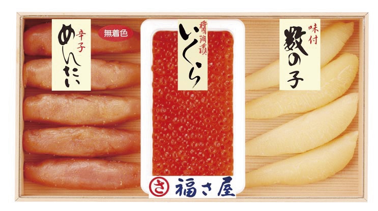 - 無着色辛子めんたいこ160g(ロシア又はアメリカ産)、味付数の子80g(アメリカ又はカナダ産)、醤油いくら60g(北海道産)(全て福岡県にて加工)