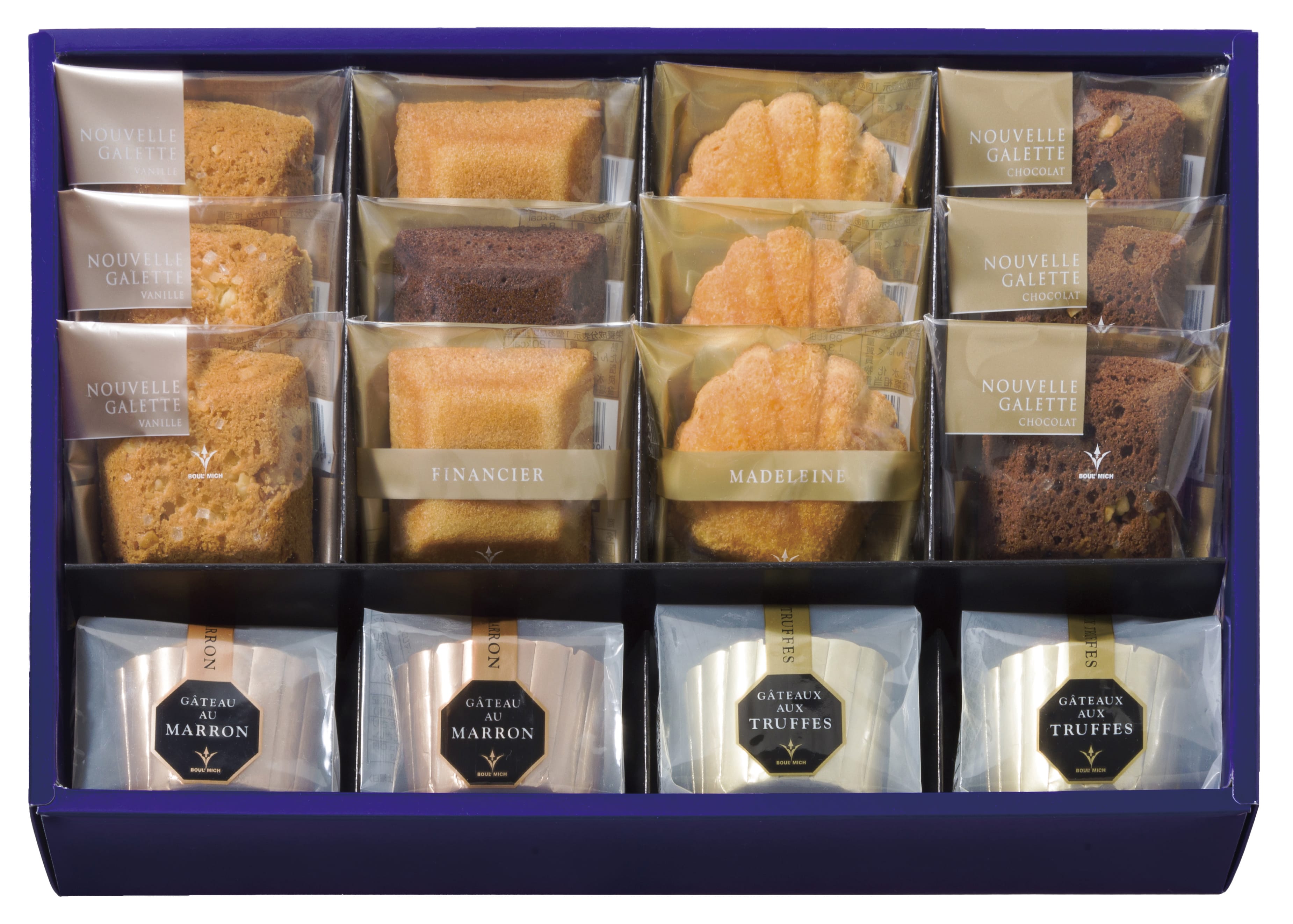 - トリュフケーキ・ガトーオマロン・フィナンシェ×各2、マドレーヌ×3、フィナンシェ(ショコラ)、ヌーヴェルガレット(バニラ・チョコ)×各3