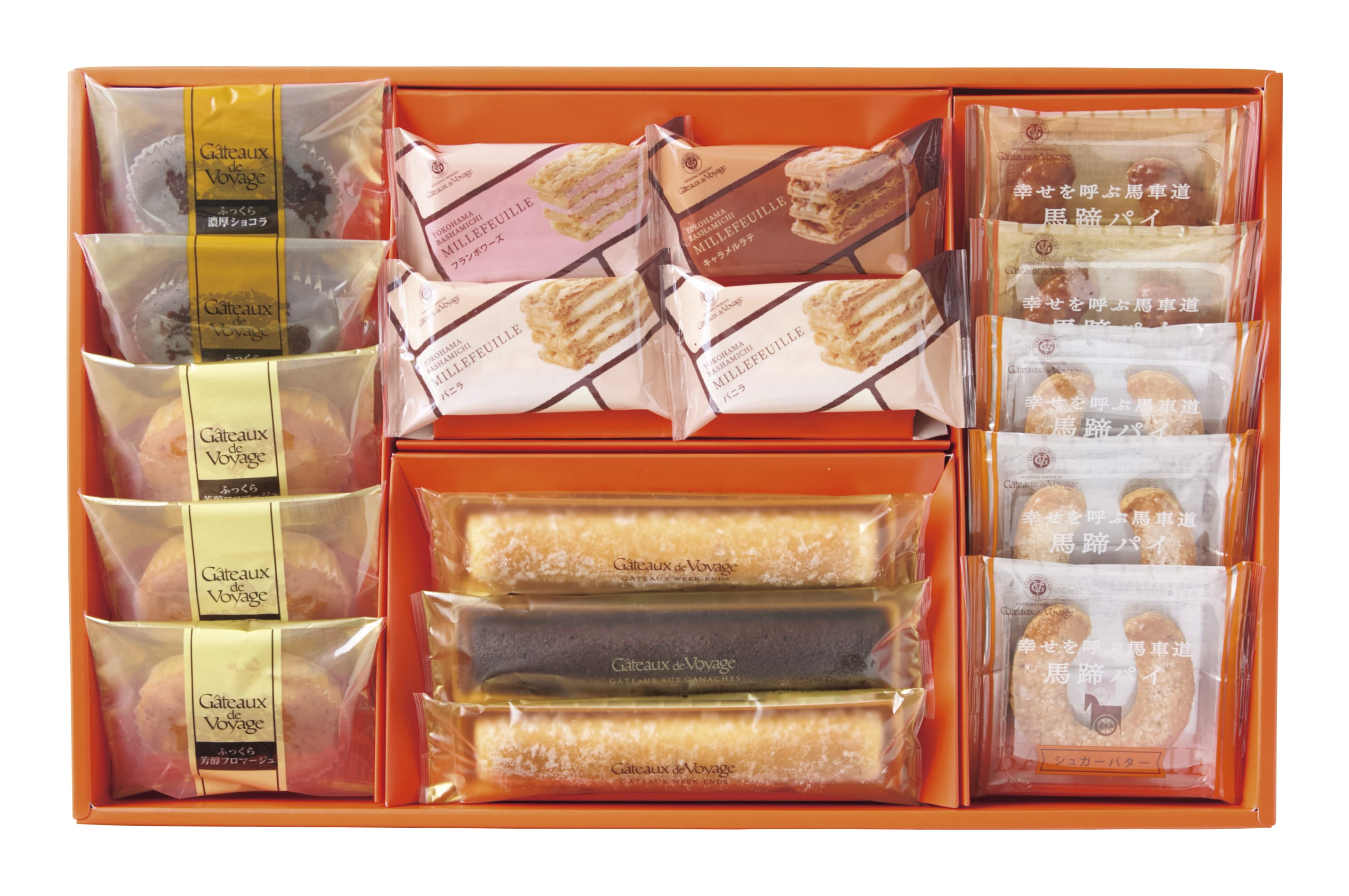 - 横浜馬車道ミルフイユ(バニラ×2・フランボワーズ・キャラメルラテ)、幸せを呼ぶ馬車道馬蹄パイ(シュガーバター×3・キャラメル×2)、ガトースフレ(ふっくら芳醇フロマージュ×3・ふっくら濃厚ショコラ×2)、ガトーウィークエンド(オレンジ)×2、ガトーオガナッシュ