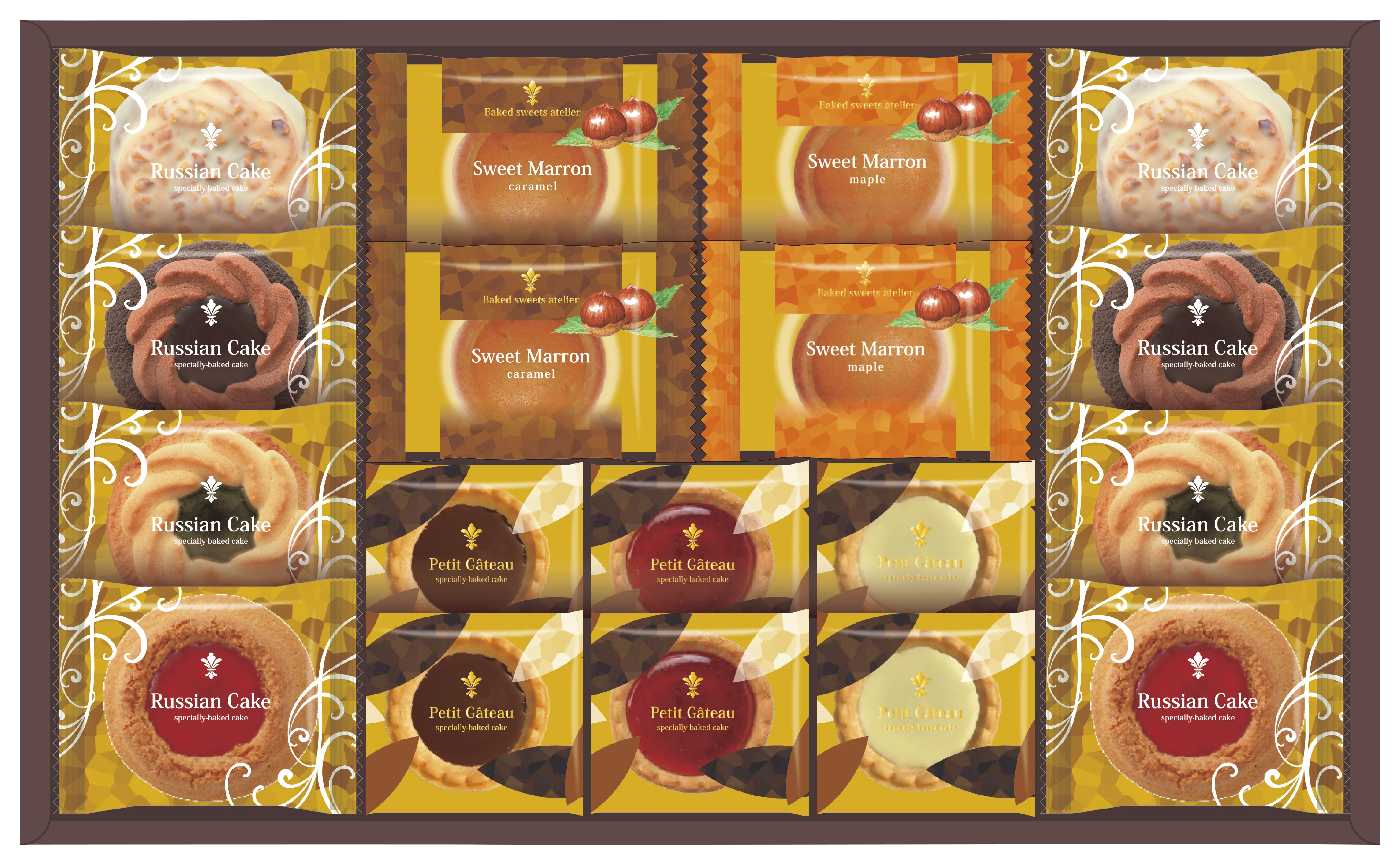 - ロシアケーキ(リッチビター・フラワーキウイ・マカロンストロベリー・ホワイトチョコ)×各2、プチガトー(ストロベリー・ミルクチョコ・ホワイトチョコ)×各2、スイートマロン(メイプル・キャラメル)×各2