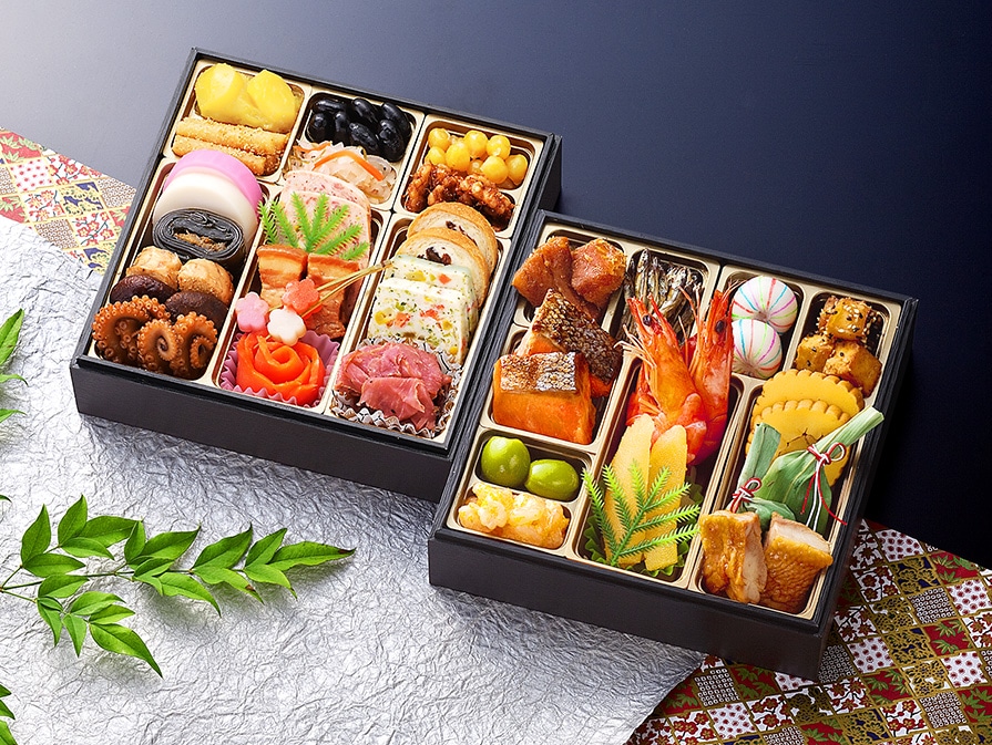 栗の甘露煮 / きんとん / 胡麻和えたたき牛蒡 / 黒豆 / 紅白生酢 / ひよこ豆 / かつおくるみ / 紅かまぼこ / 白かまぼこ / にしん昆布巻 / 魚卵の旨煮 / しいたけ焚 / 蛸旨煮 / ミートローフ / 豚角煮 / 松葉梅ゼリー / ローズサーモン / レザンアルメット / サーモンのテリーヌ / パストラミビーフ