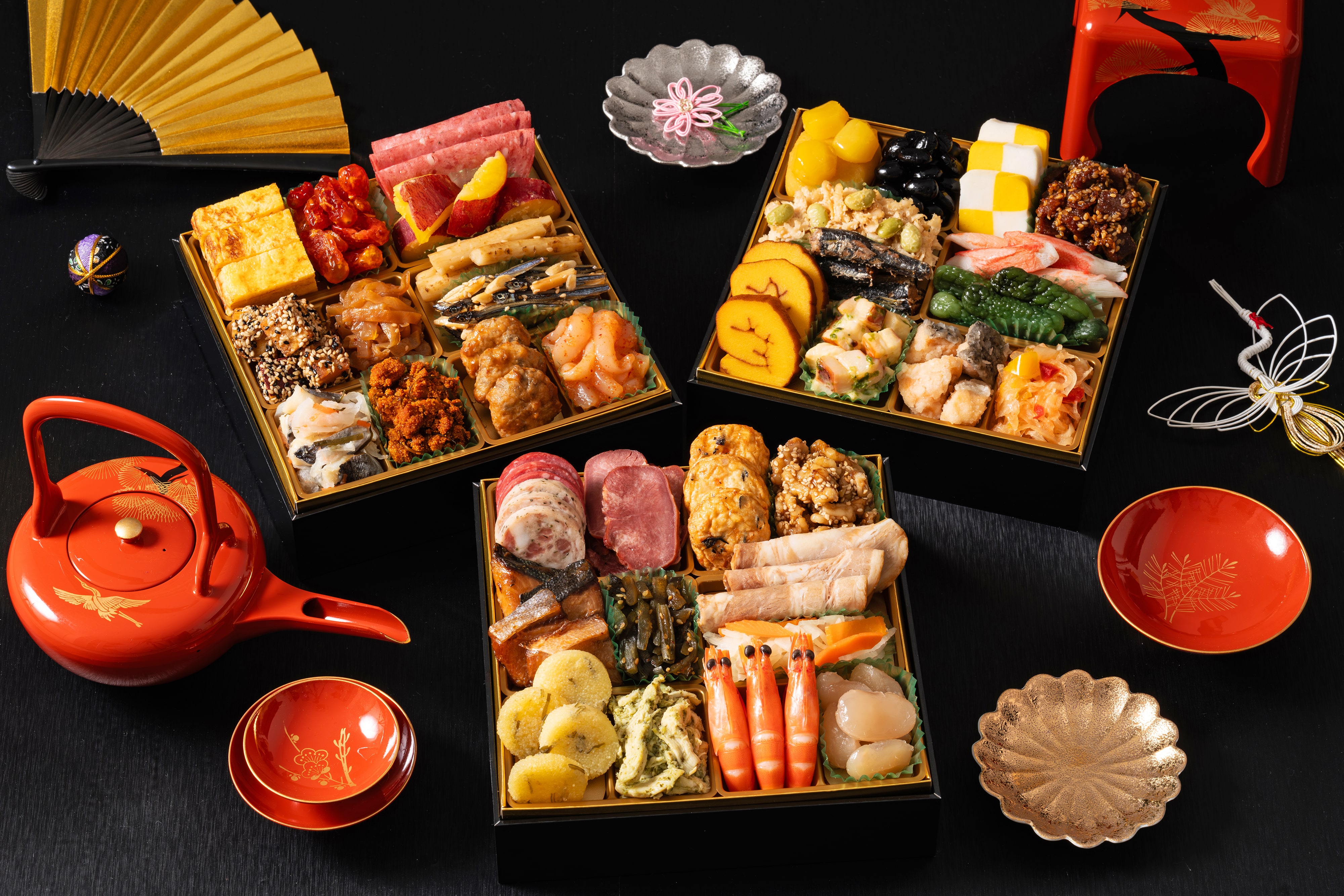 だし巻玉子 / やわらか干しとまと / 胡麻ポテ紅はるか / 中華くらげ / にしん酢漬け / 真鱈子昆布 / セミドライソーセージ / 鳴門芋金時レモン煮 / たたき牛蒡 / アーモンド田作り / 鶏つくね照焼 / いか明太和え