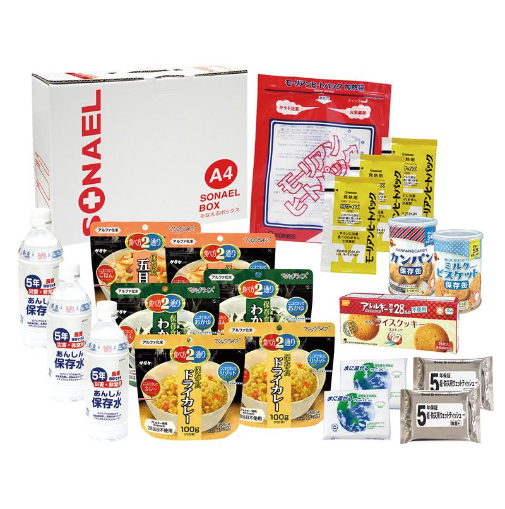 - ウェットティッシュ×2、5年保存水(500ml)×3、ライスクッキー8枚入×1、マジックライス(わかめ)×2、マジックライス(五目ごはん)×2、マジックライス(ドライカレー)×2、加熱袋×1、発熱剤×3、水に流せるペーパー×2、カンパン×1、ミルクビスケット×1
