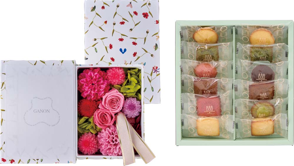 - プリザーブドフラワー(バラ×2・千日紅・アジサイ)、造花、紙製花器、お手入れのしおり、プティガトーアソルティ(フィナンシェ×2・マドレーヌ×2・キャラメル×2・抹茶×2・ピスターシュ・フランボワーズ・ミルクチョコ・フレーズ)