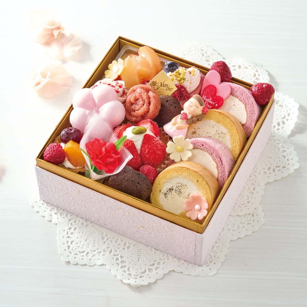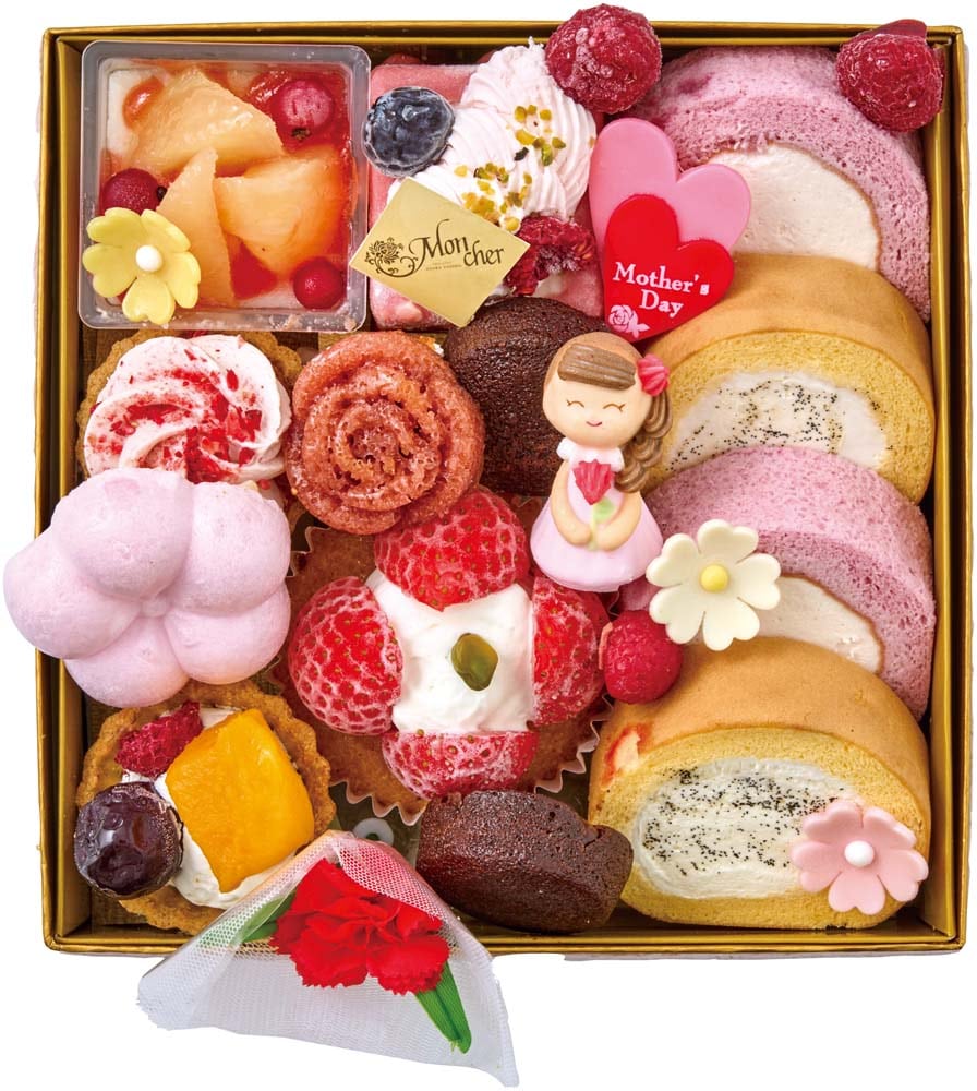 - ミニロール(バニラ・ベリー)×各2、フィナンシェショコラミニ×2、ムースピスタチオルージュ、桃プリン、ベリークリームタルト、梅ロッシェ、フルーツタルト、ストロベリーケーキ、ミニバラのフィナンシェ(フランボワーズ)、スマイルママ(砂糖菓子)、母の日ダブルハート(ハート型チョコ菓子)、お花型チョコ(ピンク・白・黄)、果実(フランボワーズ×5・ブルーベリー)、造花(カーネーションピック)