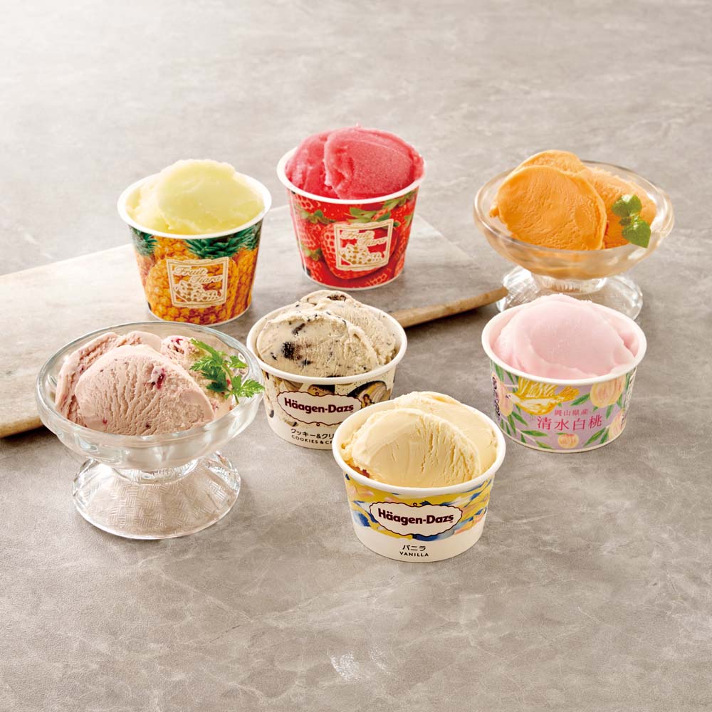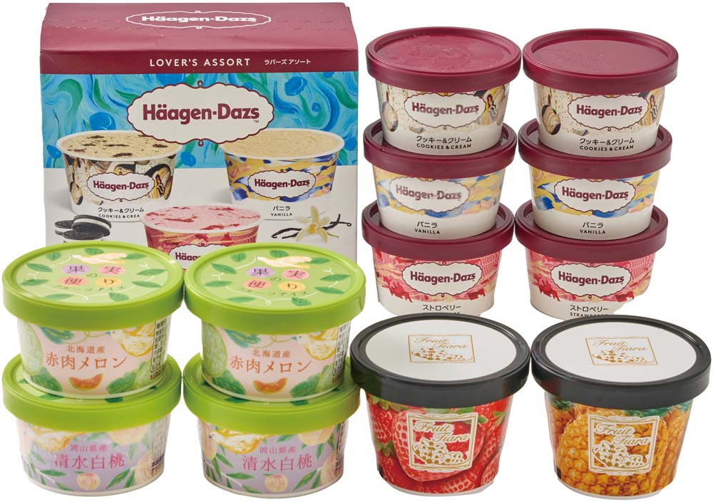 - ハーゲンダッツラバーズアソート(バニラ・ストロベリー・クッキー&クリーム)各70ml×各2、フルーツティアラソルベ(イチゴ・パインアップル)各108ml、国産フルーツアイス(北海道メロン・清水白桃)各70ml×各2