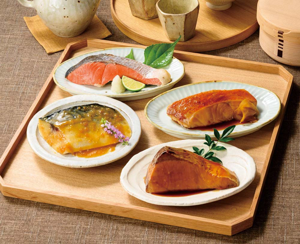 - さばの味噌煮・ぶりの照焼き各90g×各2、めぬけと黄金生姜の煮付け100g、紅鮭の塩焼き60g