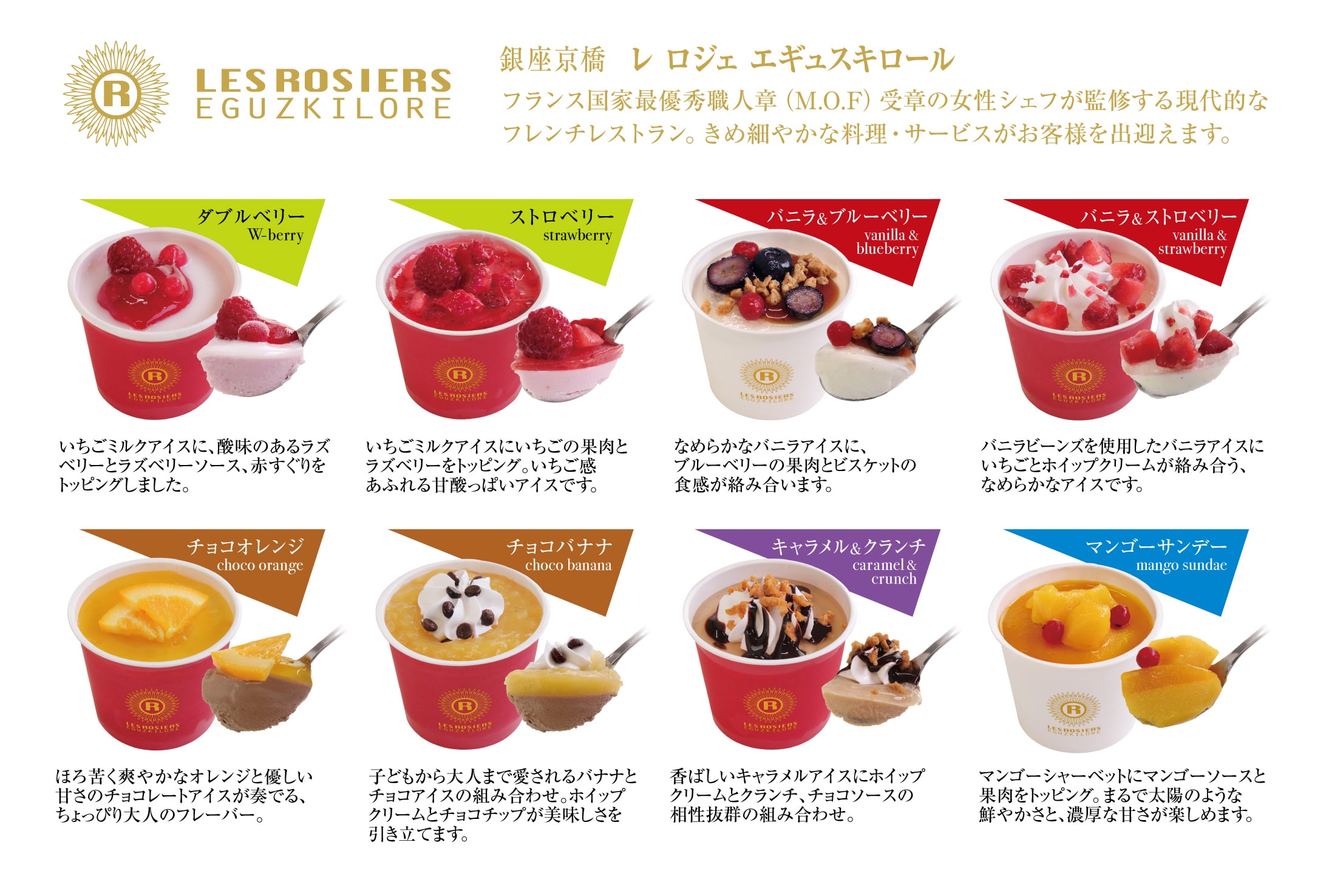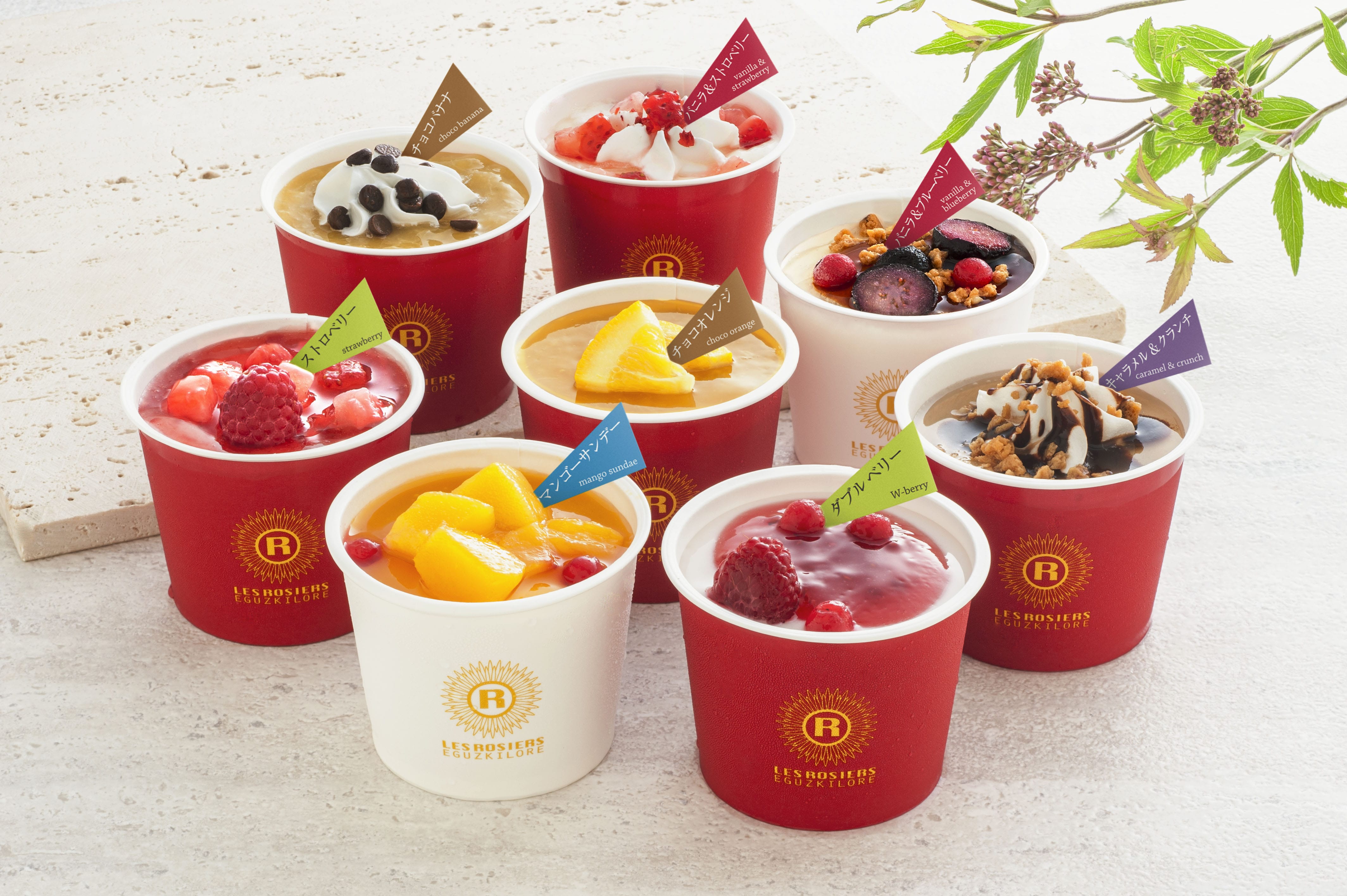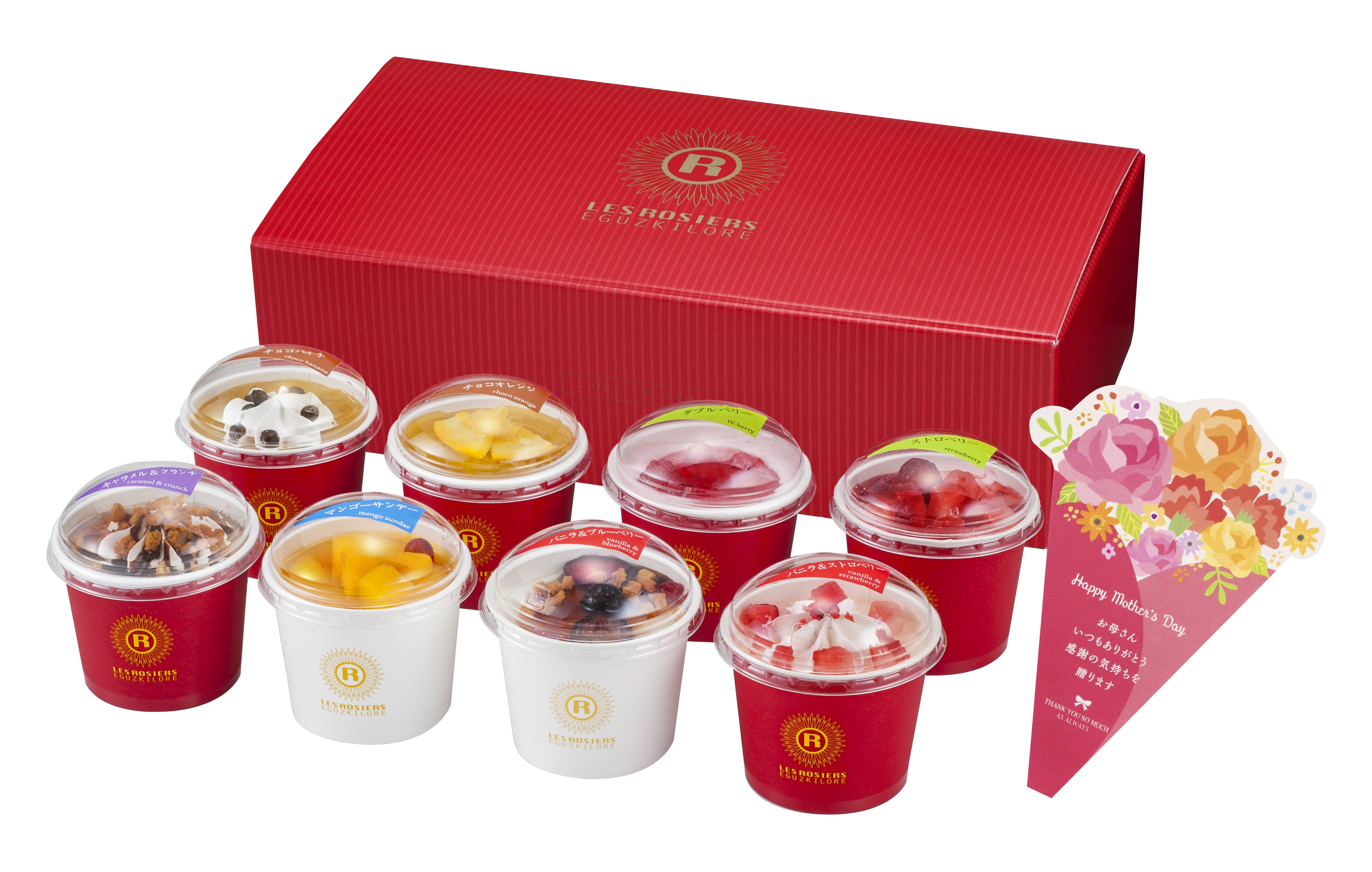 - ダブルベリー・ストロベリー・マンゴーサンデー・バニラ&ブルーベリー・チョコオレンジ・チョコバナナ・キャラメル&クランチ・バニラ&ストロベリー 各105ml×各1 (計8個)※メッセージブーケ付