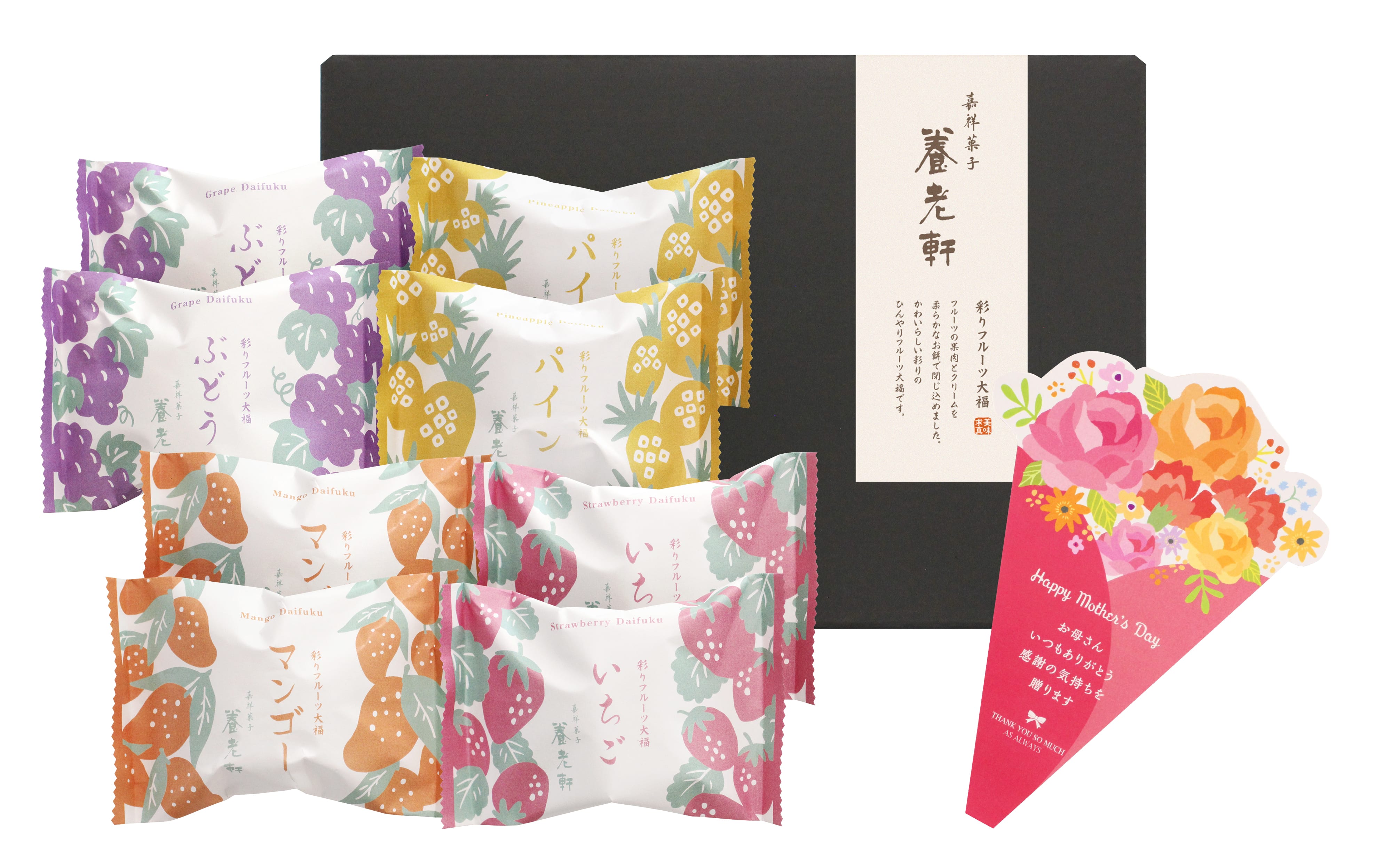 - いちご・マンゴー・ぶどう・パイナップル×各2(計8個) ※メッセージブーケ付