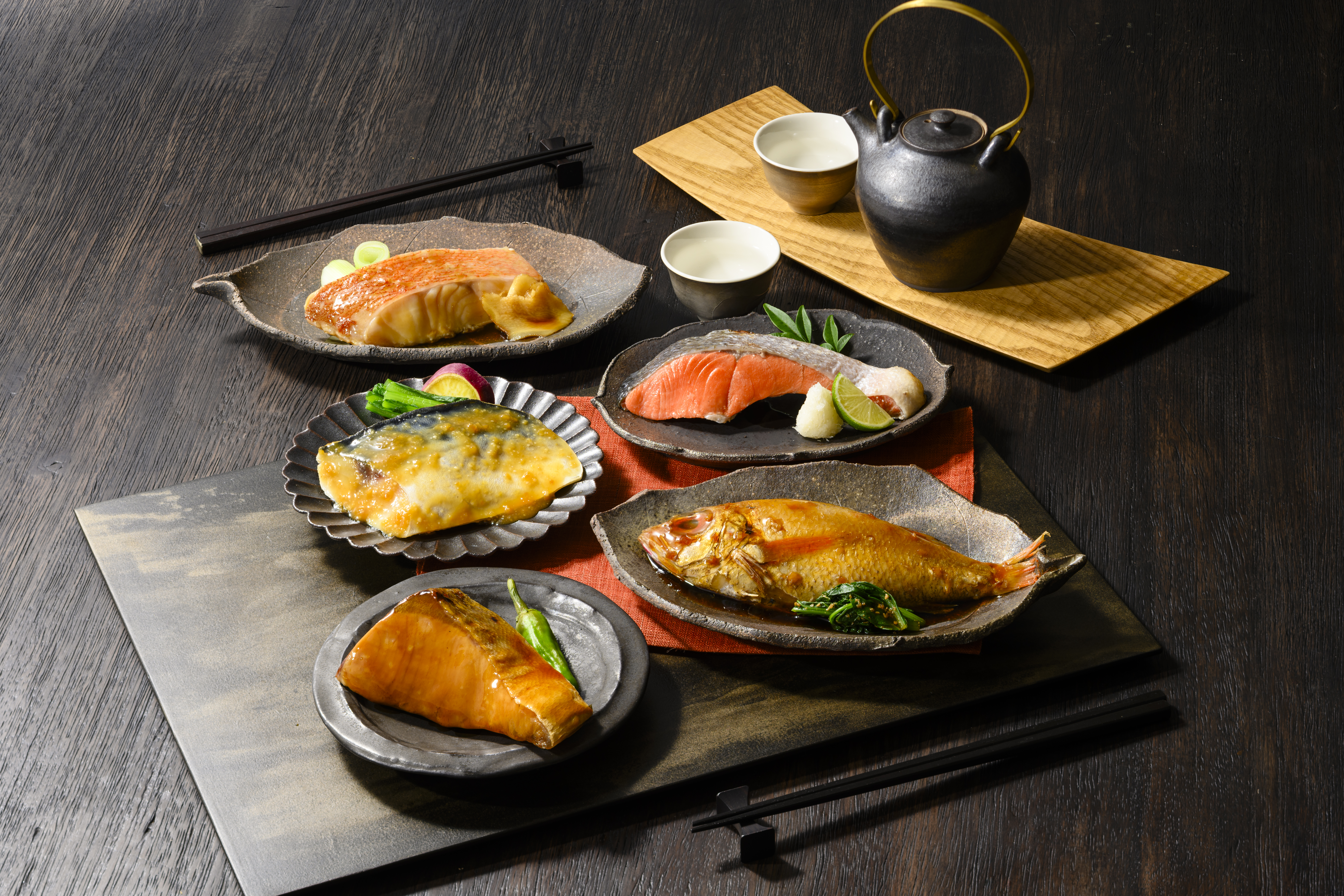 - めぬけと黄金生姜の煮付け100g×2、さばの味噌煮90g×2、紅鮭の塩焼き60g×2、ぶりの照焼き90g×2、のどぐろ煮付け85g×2