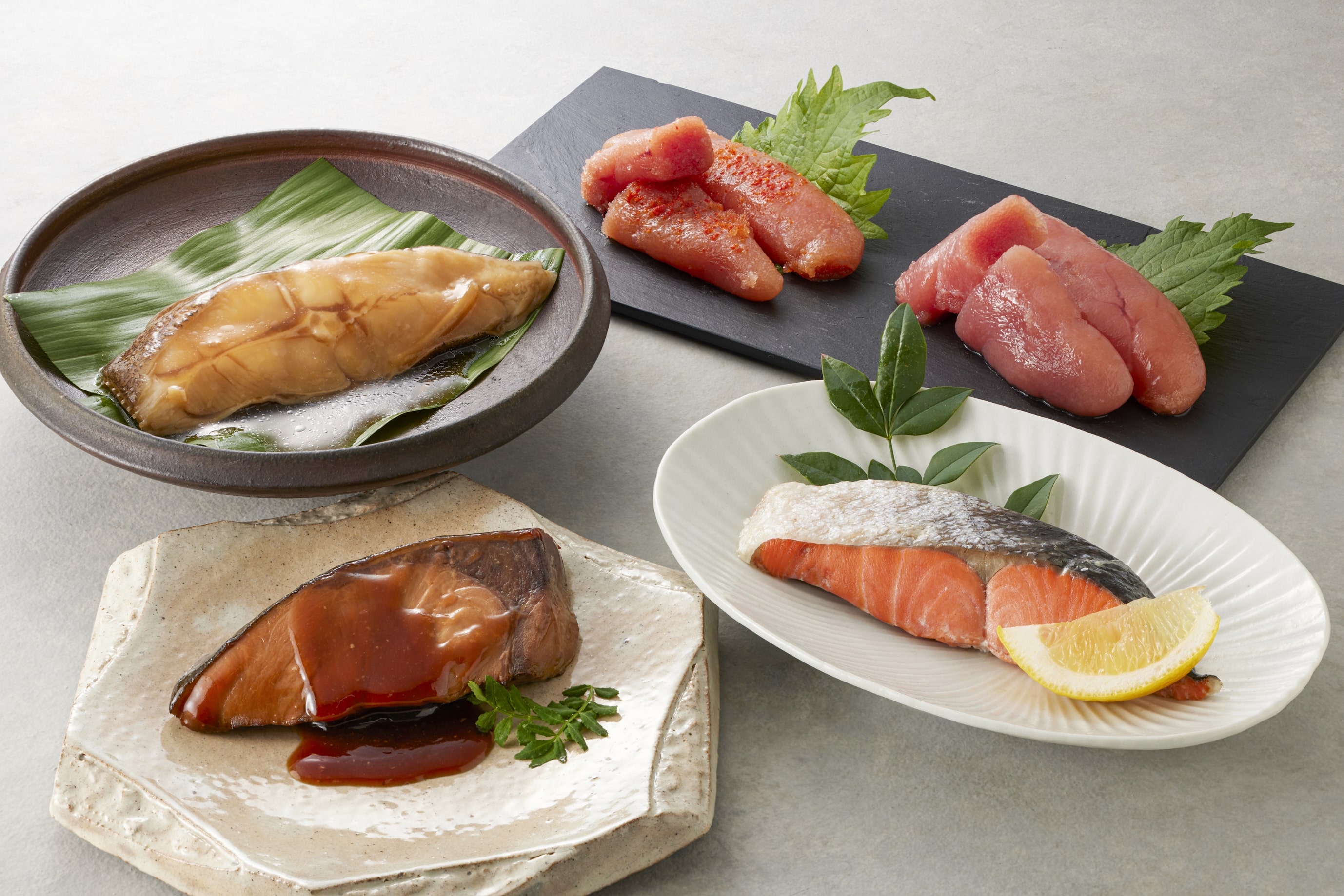 - 辛子明太子150g、あごだしうまみたらこ150g、かれい醤油煮100g×1、紅鮭塩焼き60g×1、ぶりの照焼き90g×2