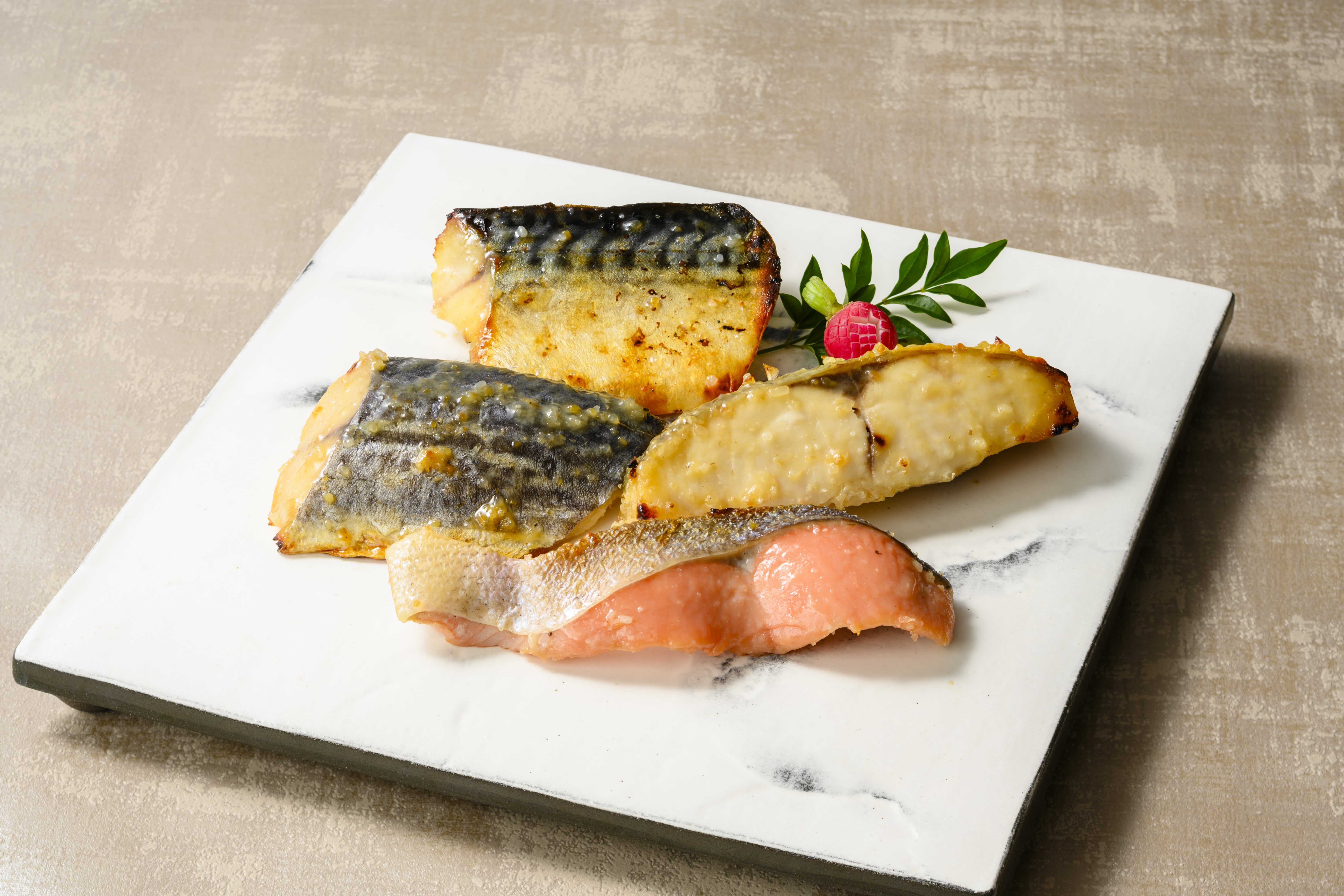 - 銀ひらす西京漬け60g×2、鯖西京漬け60g×2、銀鮭西京漬け60g×2、さわら西京漬け70g×2