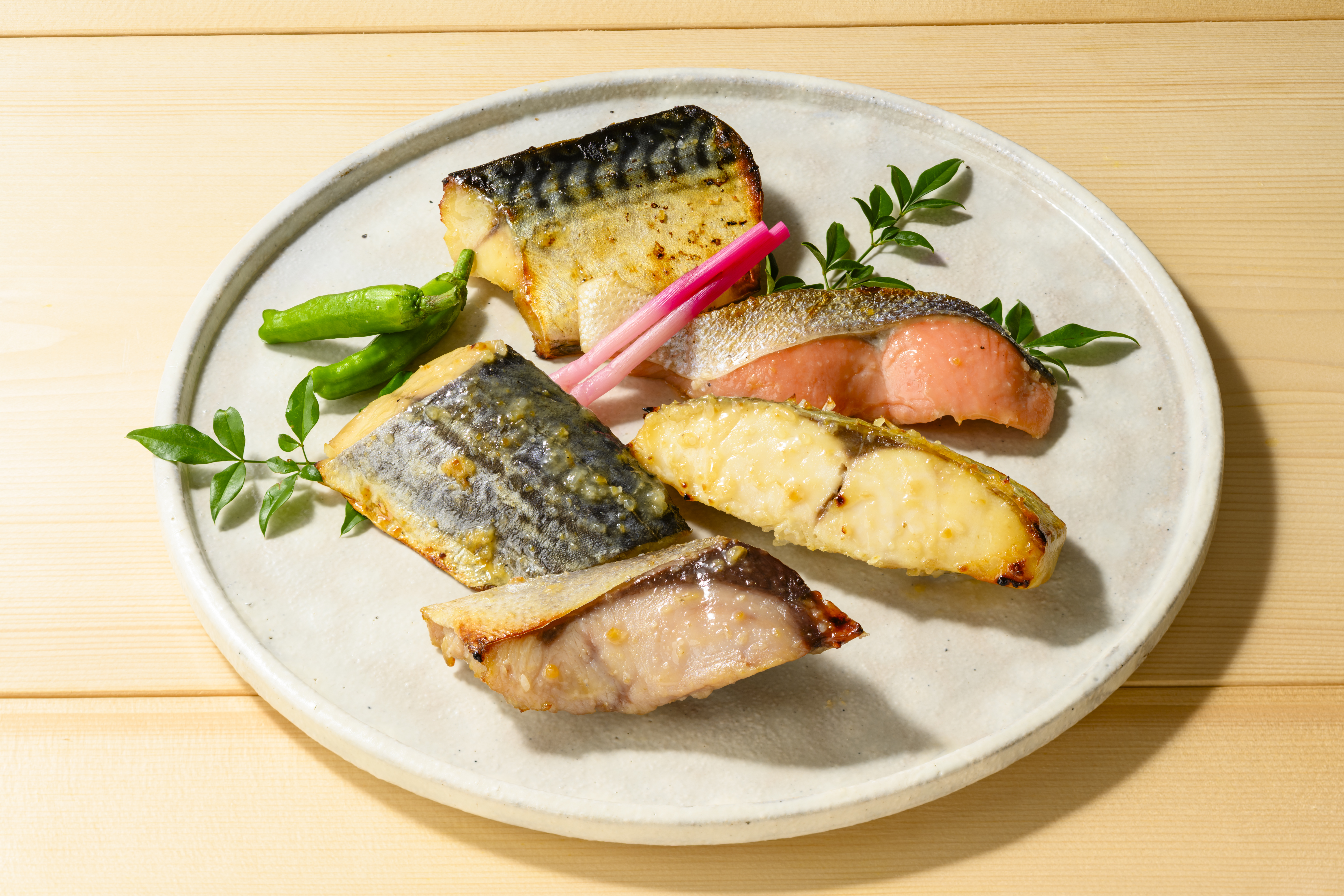 - 銀ひらす西京漬け60g×2、鯖西京漬け60g×2、銀鮭西京漬け60g×2、さわら西京漬け70g×2、ぶり西京漬け70g×2
