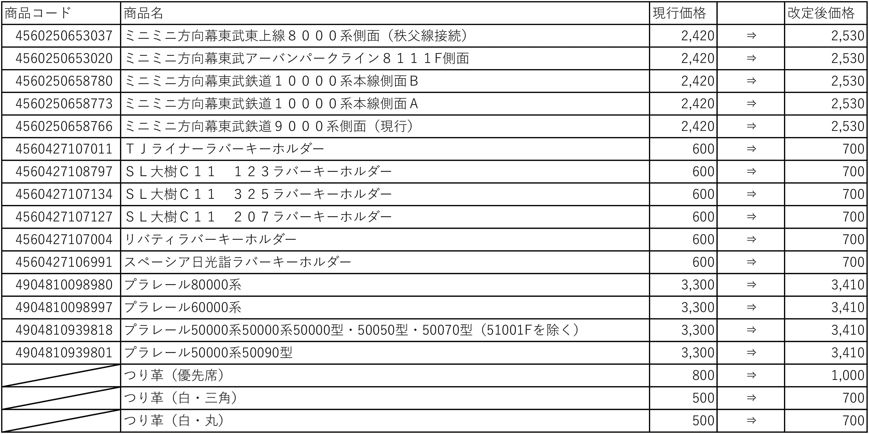 【重要】オリジナル鉄道グッズ価格改定のお知らせ 平素より、弊社鉄道グッズをご愛顧いただき誠にありがとうございます。 このたび、仕入れ価格等高騰に伴い、2026年4月1日(水)より一部商品の価格改定(値上げ)を実施させていただきます。 また一部商品についてはよりお求めやすい価格に変更いたしますので、是非この機会にご利用ください。 今後もより多くのお客様の声にお応えできるよう、商品企画に努めてまいります。 何卒ご理解を賜りますようお願い申し上げます。 価格改定対象商品一覧(値上げ) 価格改定対象商品一覧(値下げ) ※価格は全て税込みです。